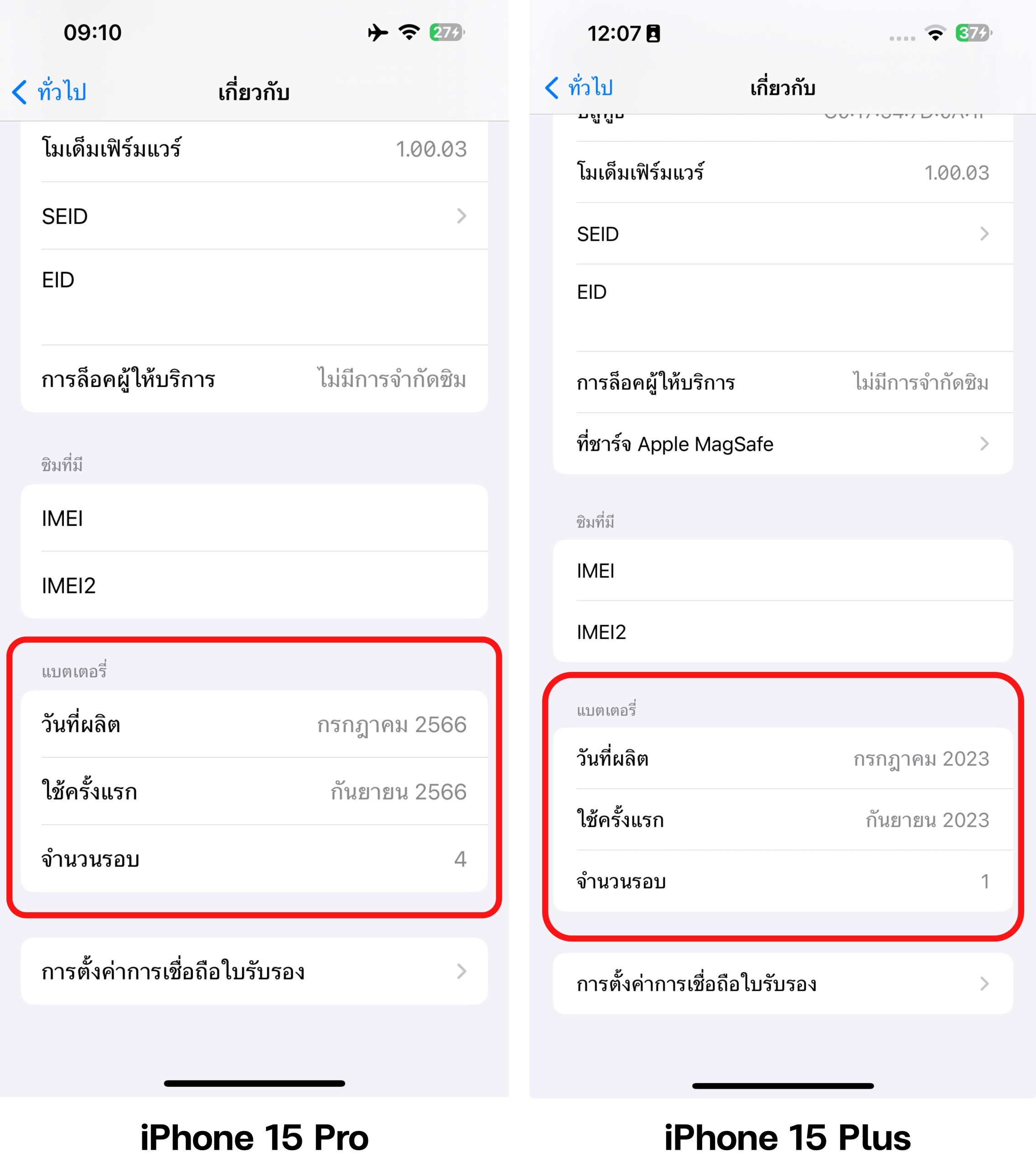 ในส่วนแบตเตอรี่จะแสดงข้อมูลว่า iPhone 15 เครื่องนั้นใช้รอบแบตเตอรี่ไปกี่รอบแล้ว และยังแสดงข้อมูลวันที่ผลิต และวันใช้แบตครั้งแรกอีกด้วย