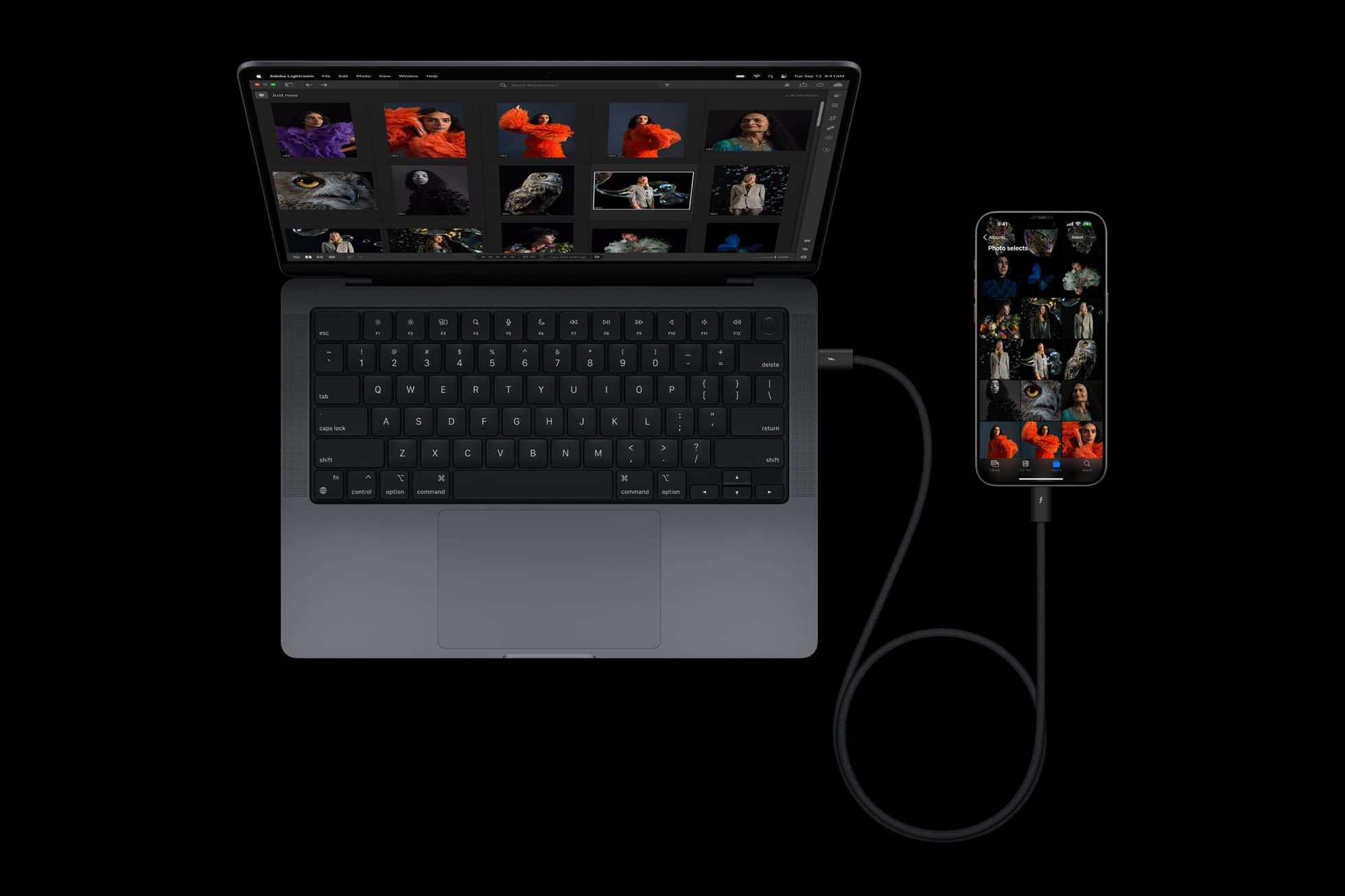 จึงใช้สายเส้นเดียวกันเพื่อชาร์จได้ทั้ง iPhone, Mac, iPad และ AirPods Pro (รุ่นที่ 2) ที่ได้รับการอัปเดตใหม่ ผู้ใช้ยังสามารถชาร์จ AirPods หรือ Apple Watch ได้โดยตรงจาก iPhone โดยใช้ขั้วต่อ USB‑C ด้วย นอกจากนี้ iPhone 15 Pro และ iPhone 15 Pro Max ยังรองรับ USB 3 ซึ่งให้ความเร็วในการถ่ายโอนข้อมูลสูงสุด 10 กิกะบิตต่อวินาที หรือเร็วขึ้นกว่าที่ผ่านมาถึง 20 เท่า