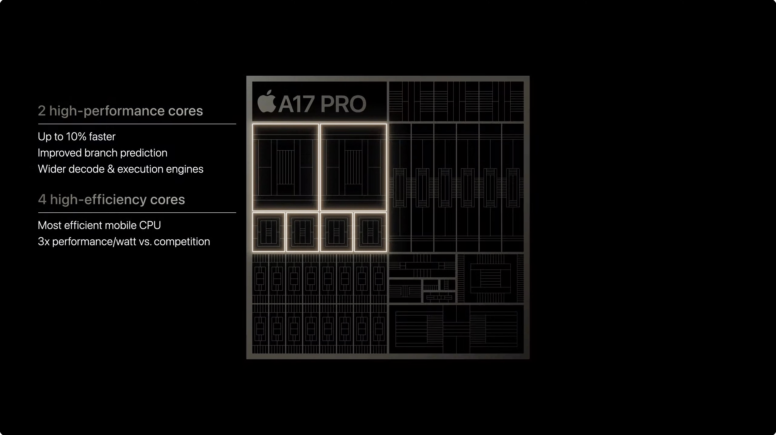 iPhone 15 Pro และ iPhone 15 Pro Max มีประสิทธิภาพการทำงานและความสามารถระดับโปร เพราะขับเคลื่อนด้วยชิป A17 Pro ซึ่งเป็นชิป 3 นาโนเมตรตัวแรกในอุตสาหกรรม โดยชิป A17 Pro ได้รับการปรับปรุงใหม่ในทุกส่วน