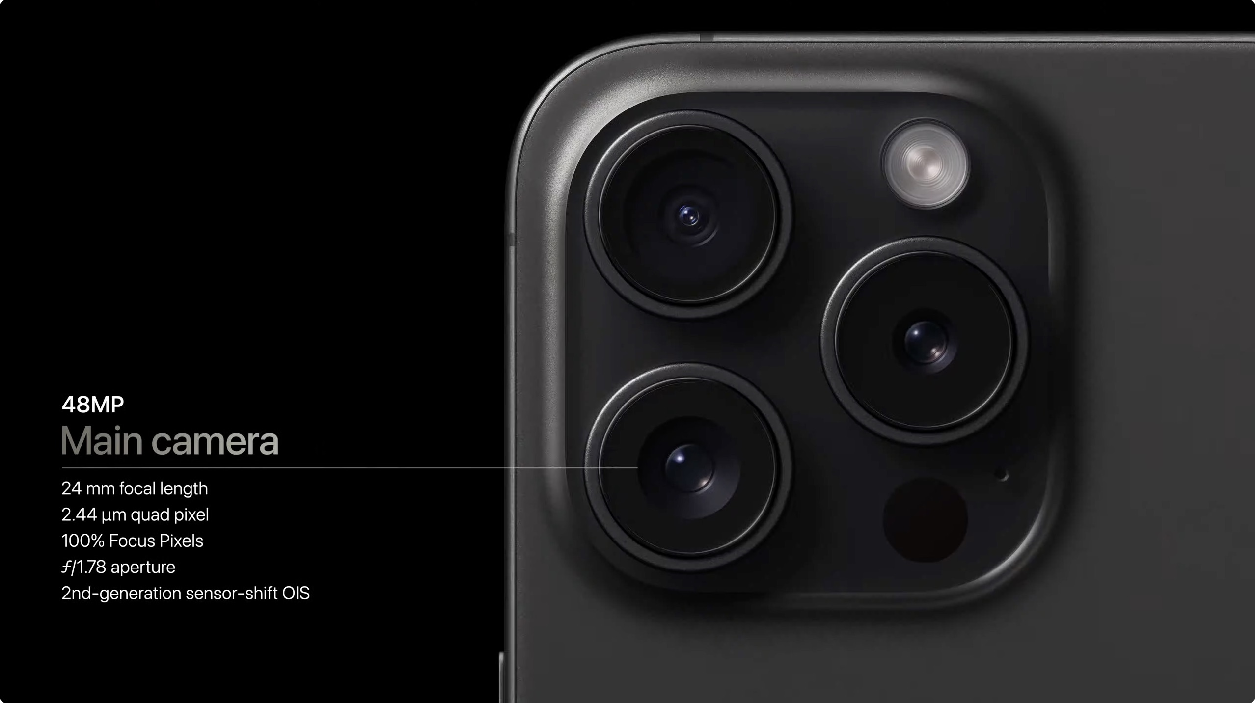 ระบบกล้องสุดล้ำบน iPhone 15 Pro และ iPhone 15 Pro Max มีฮาร์ดแวร์และซอฟต์แวร์ที่ทำงานผสานกันอย่างล้ำลึกจนเทียบเท่าเลนส์ระดับโปร 7 ตัว ทั้งหมดเป็นไปได้ด้วยชิป A17 Pro นอกจากนี้กล้องหลัก 48MP ที่สร้างขึ้นโดยเฉพาะสำหรับผลิตภัณฑ์ตระกูล Pro