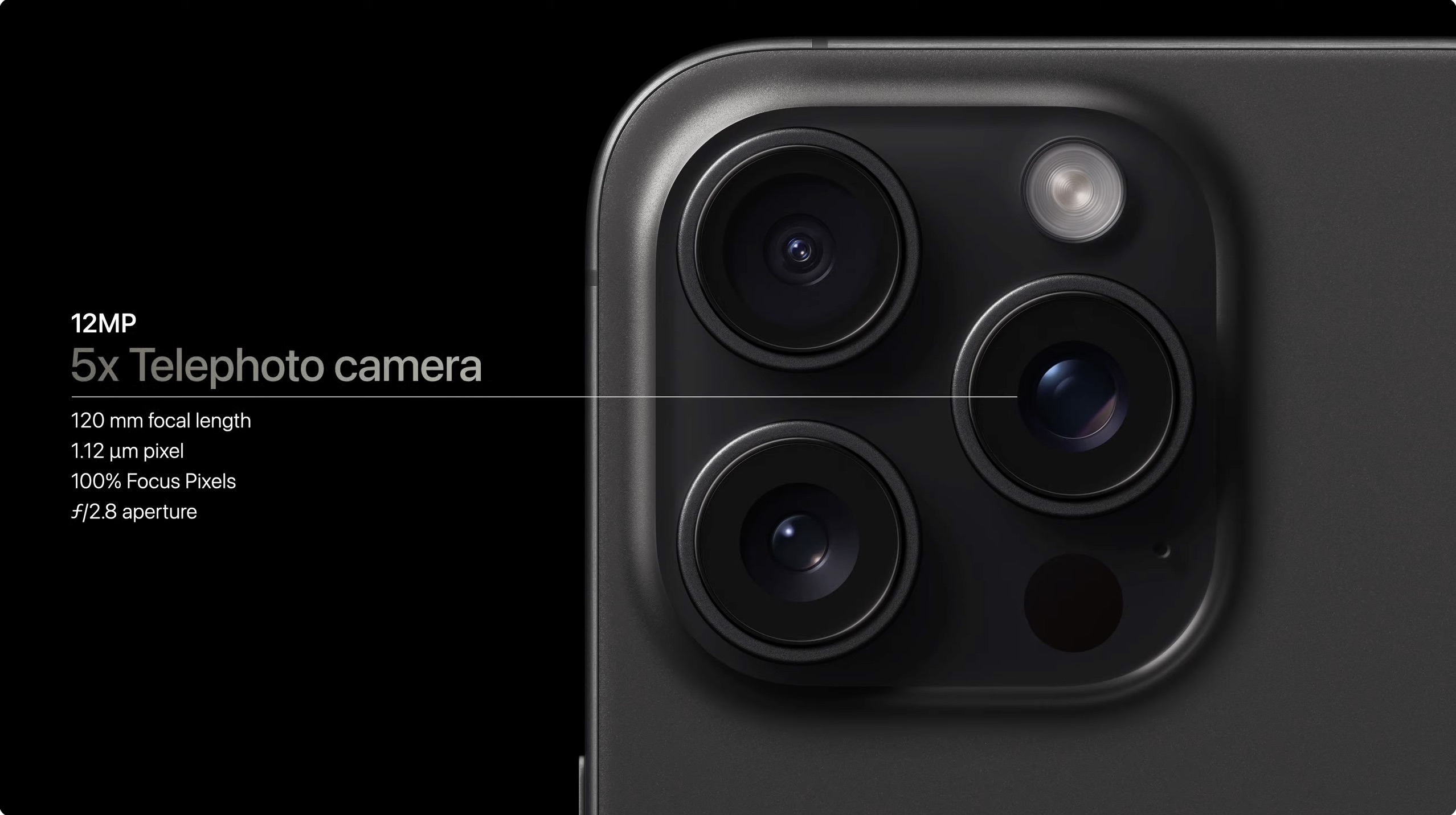 เพิ่มเติมจากการรองรับ ProRAW ความละเอียด 48MP สำหรับ iPhone 15 Pro นั้นมาพร้อมกล้องเทเลโฟโต้ 3 เท่า ขณะที่ iPhone 15 Pro Max มอบการซูมแบบออปติคัลได้ไกลที่สุดเท่าที่เคยมีมาใน iPhone ถึง 5 เท่า ที่ 120 มม. ทั้งนี้กล้องเทเลโฟโต้ใหม่ใน iPhone 15 Pro Max