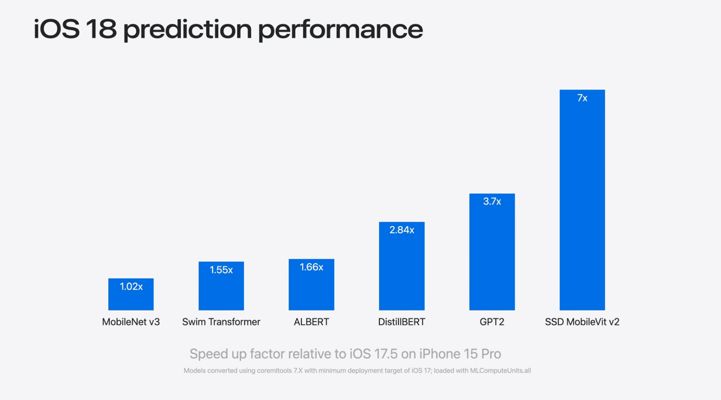 นอกจากนั้น Apple ได้คาดการณ์ตัวเลขประสิทธิภาพของ iPhone 15 Pro ที่ติดตั้ง iOS 18 ว่า จะมีประสิทธิภาพของโมเดลระบบ Machine Learning เพิ่มขึ้น โดย MobibleNet v3 เพิ่มขึ้น 2%, ALBERT เพิ่มขึ้น 66%, SSD MobileVit v2 เพิ่มขึ้นมากถึง 700%