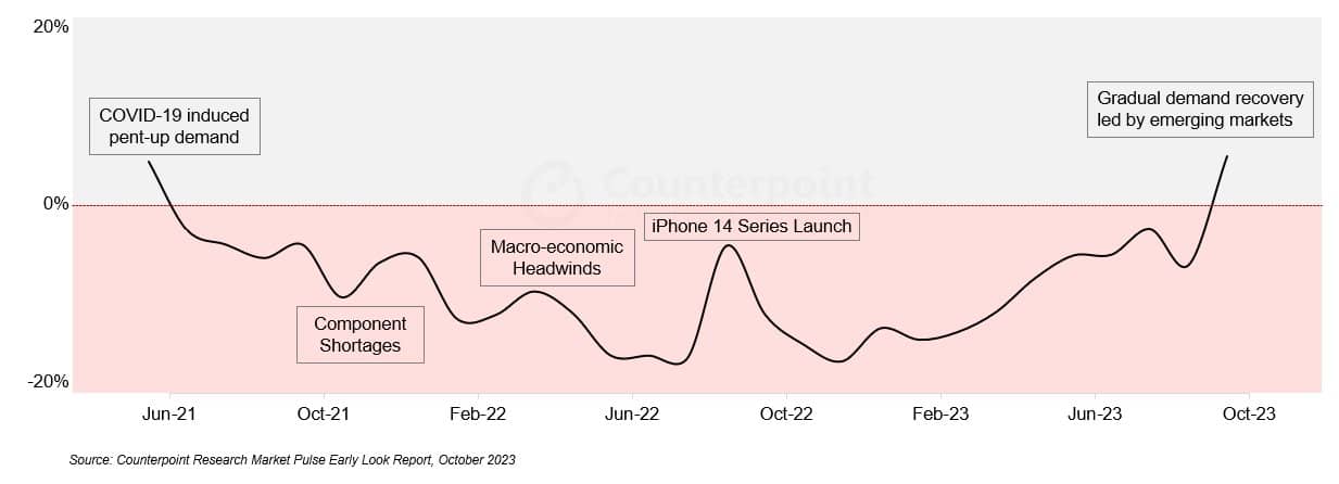 แต่หลังจากที่ iPhone 14 เปิดตัวช่วงปลายปี 2022 นั้น, Counterpoint เผยว่าตลาดสมาร์โฟนกลับมาดีขึ้น แต่ก็กลับลดลงไปอีกครั้ง ก่อนที่จะกลับมาเพิ่มขึ้นหลังจากที่ iPhone 15 เปิดตัวและเปิดขายในช่วงเดือน ก.ย. – ต.ค. 2023 ปีนี้