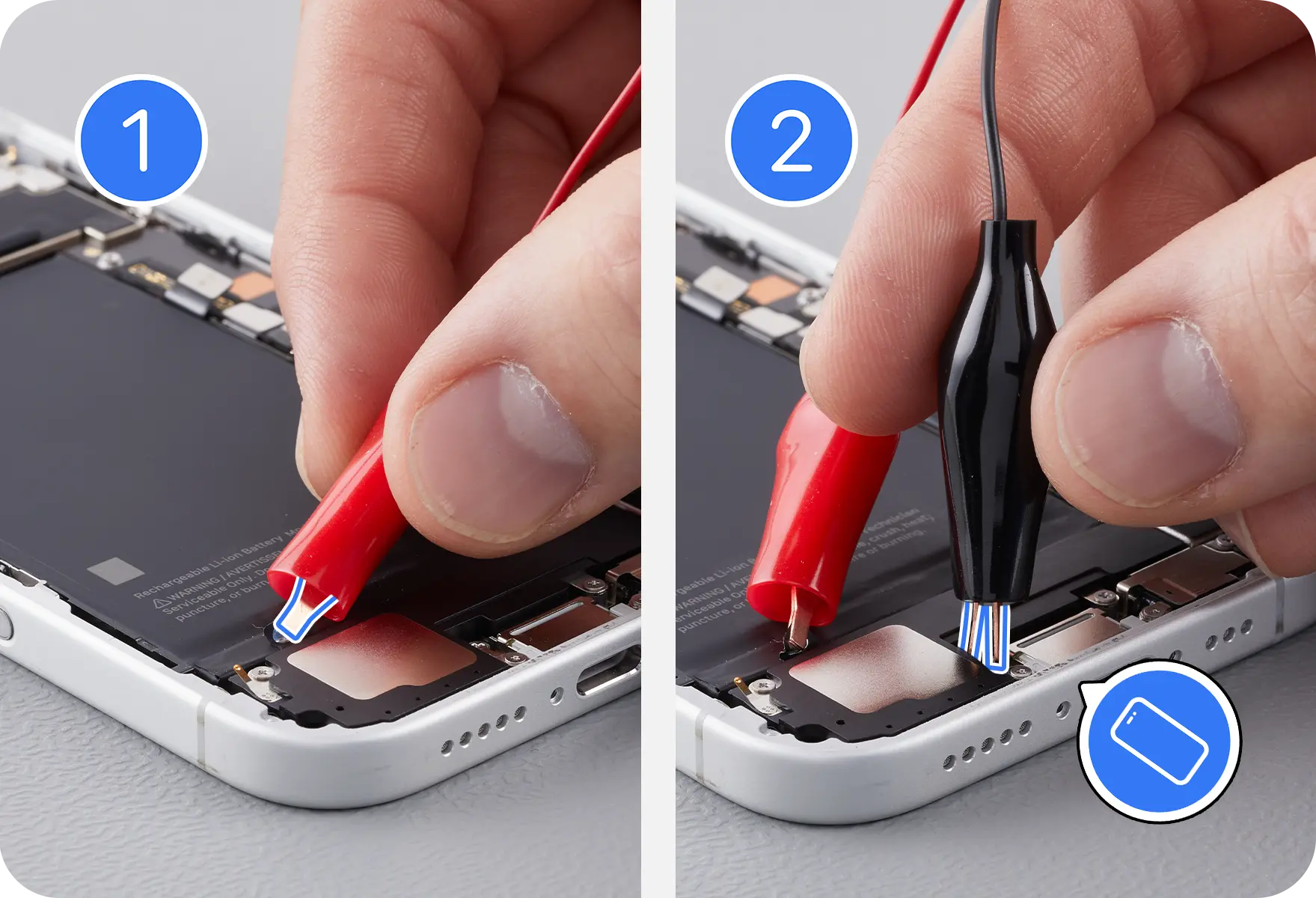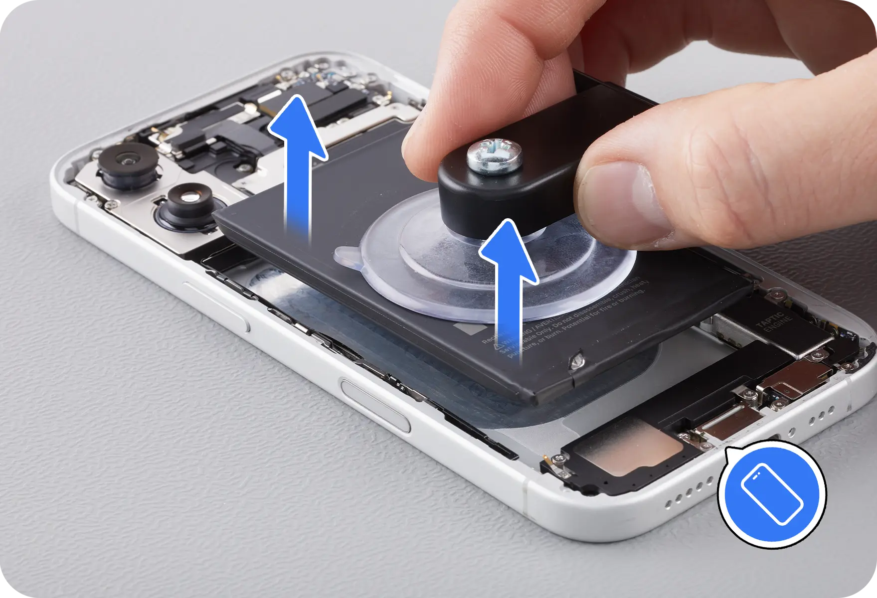 สำหรับการถอดแบต iPhone 16, iPhone 16 Plus นั้นจะใช้วิธีการถอดด้วย “กระแสไฟฟ้า” โดย Apple ระบุว่าให้นำแบตเตอรี่ขนาด 9-volt มาเชื่อมต่อกับชิ้นส่วนภายในของ iPhone 16 ทิ้งไว้ราว 1.30 นาที แล้วก็ใช้ตัวดูด ดูดแบตเตอรี่ออกมาได้เลย