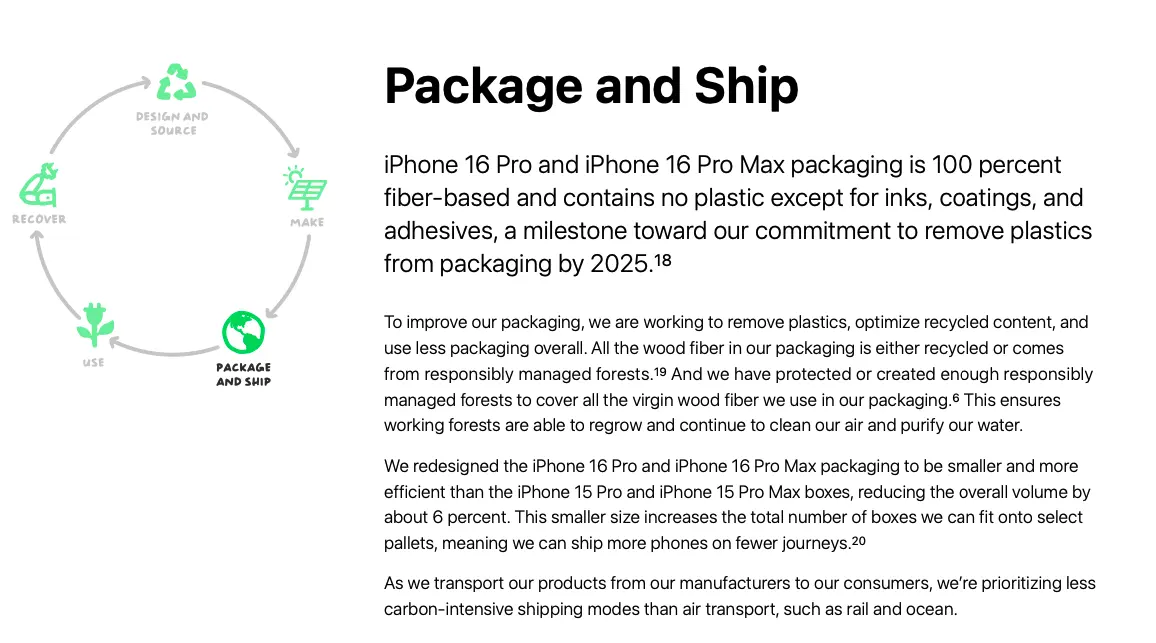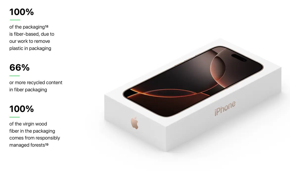 การเปลี่ยนแปลงที่เกิดขึ้นนี้เป็นส่วนหนึ่งของเป้าหมายด้านสิ่งแวดล้อมของ Apple ที่ต้องการปล่อยคาร์บอนเป็นศูนย์ (Zero Carbon) ภายในปี 2030, โดยตอนที่ Apple เปิดตัว iPhone 16 นั้นก็เผยว่าตัวกล่องทำจากวัสดุไฟเบอร์ทั้งหมด ซึ่งเป็นส่วนหนึ่งของการนำพลาสติกออกจากกล่องสินค้าทั้งหมดภายในปี 2025