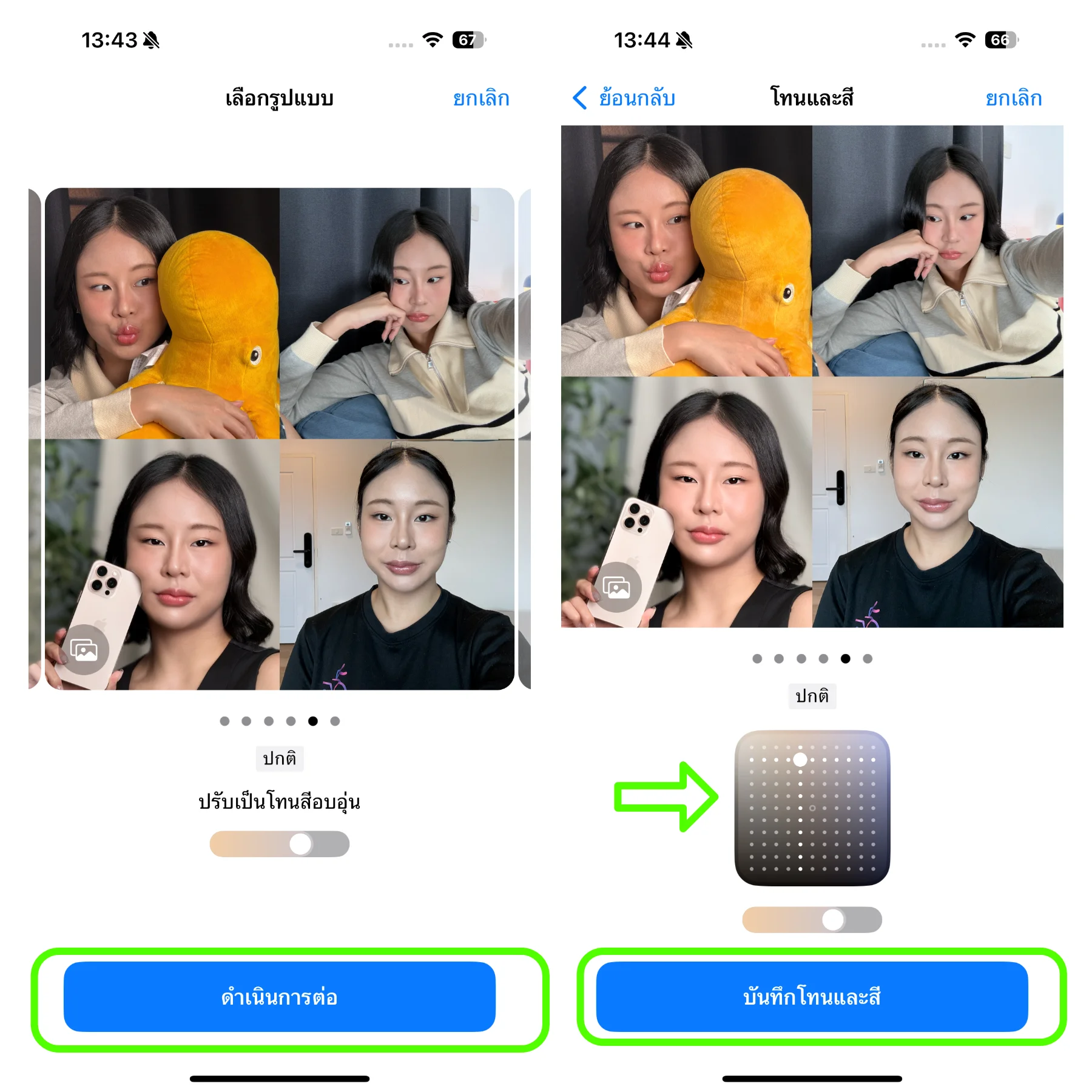 เลือกโทนที่ชอบ หากใครชอบโทนธรรมชาติ ผิวสาว ๆ นัว ๆ แนะนำให้เป็นโทน “ปกติ” เมื่อเลือกเสร็จแล้วให้กด “ดำเนินการต่อ”