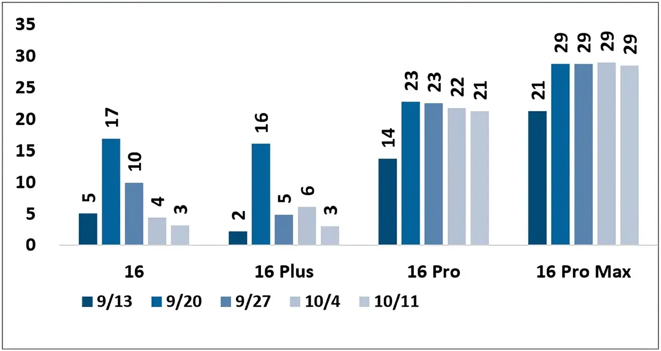 J.P. Morgan รายงานข้อมูลระยะเวลาการส่งมอบ iPhone 16 หลังจากเปิดขายผ่านไป 5 สัปดาห์ ดังนี้