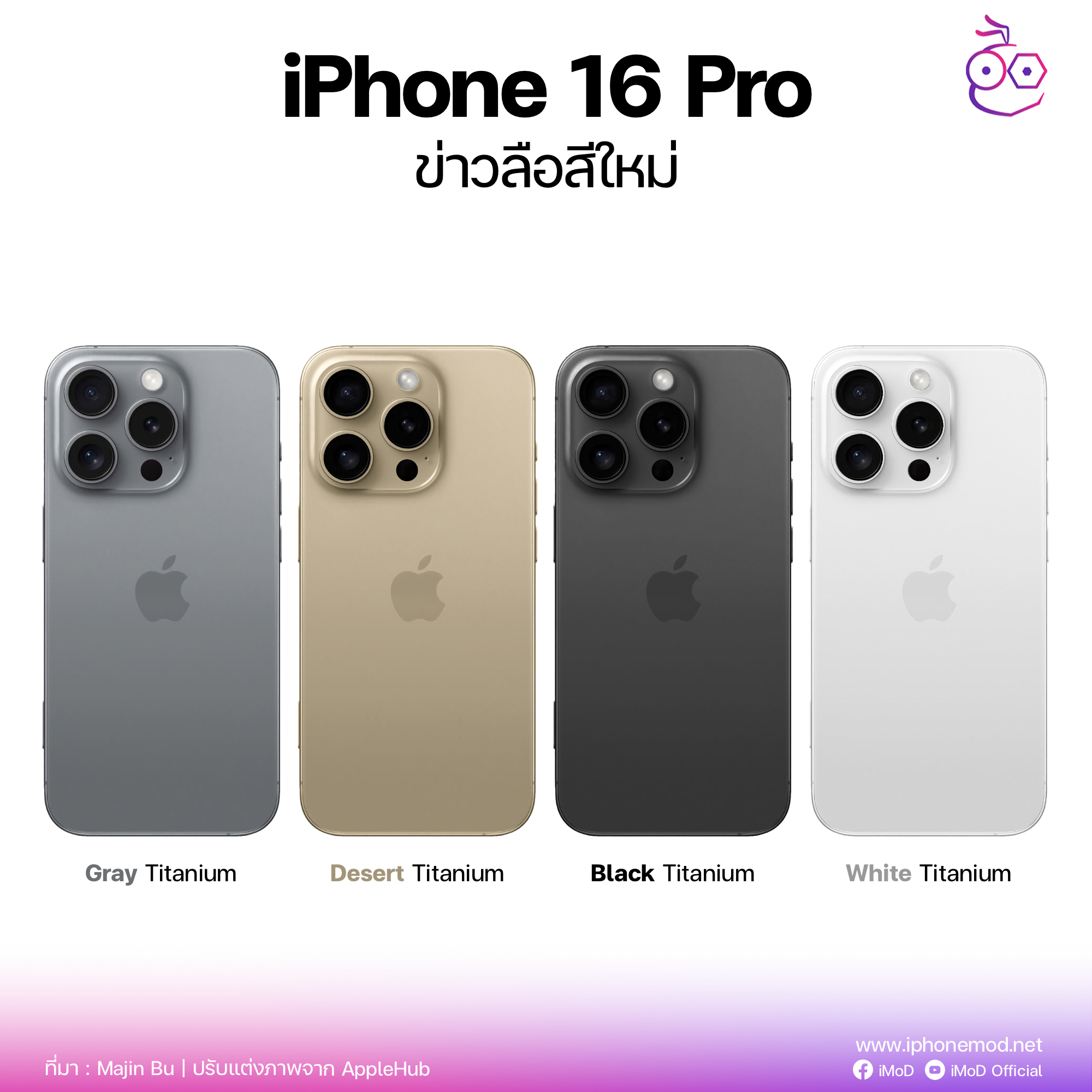 รายงานเผยว่าสี Titanium Natural และ Titanium White ของ iPhone 16 Pro นั้นจะมีโทนสีแตกต่างจากของ iPhone 15 Pro ด้วย โดยสี Titanium Natural ใหม่จะอมเทามากขึ้น ส่วน Titanium White จะออกเป็นสี “ขาวเงิน” คล้ายสี Silver ของ iPhone 14 Pro