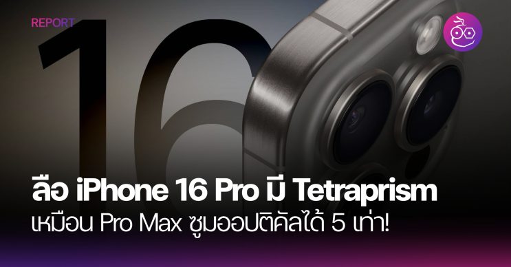 จากชิ้นส่วนที่มีความพร้อมมากขึ้นทำให้มีรายงานว่า Tetraprism จะถูกนำมาใส่ใน iPhone 16 Pro จอ 6.3″ นิ้วด้วย ทำให้ iPhone 16 Pro, 16 Pro Max สามารถซูมออปติคัลได้ 5 เท่าเหมือนกัน!