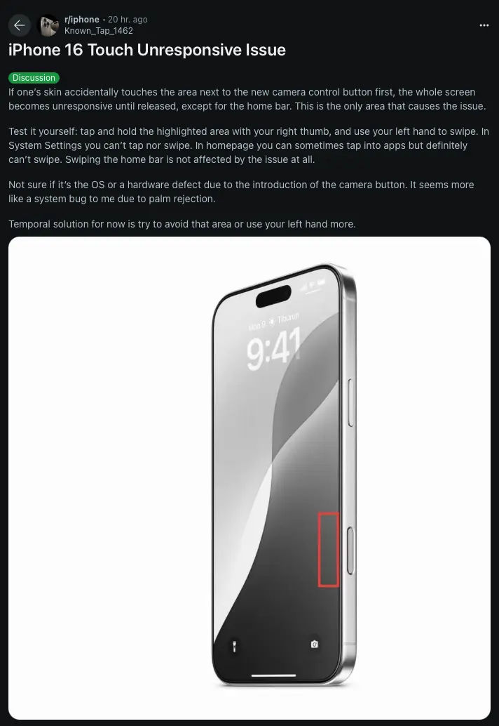 หนึ่งในผู้ใช้ปัญหาเผยว่า ปัญหานี้จะเกิดขึ้นบ่อยหากวางนิ้วไว้ใกล้ ๆ Camera Control หรือที่ด้านขวาของหน้าจอ โดยเมื่อวางนิ้วแล้วจะทำให้ไม่สามารถสัมผัสในส่วนอื่น ๆ ของหน้าจอได้