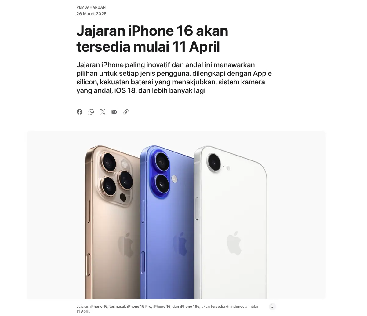 iPhone 16, iPhone 16 Plus, iPhone 16 Pro, iPhone 16 Pro Max และ iPhone 16e จะกลับมาเปิดจำหน่ายในอินโดนีเซียได้ในวันที่ 11 เม.ย. 2025 หลังตัวอุปกรณ์ได้รับการรับรองจากโทรคมนาคมของอินโดนีเซียแล้ว