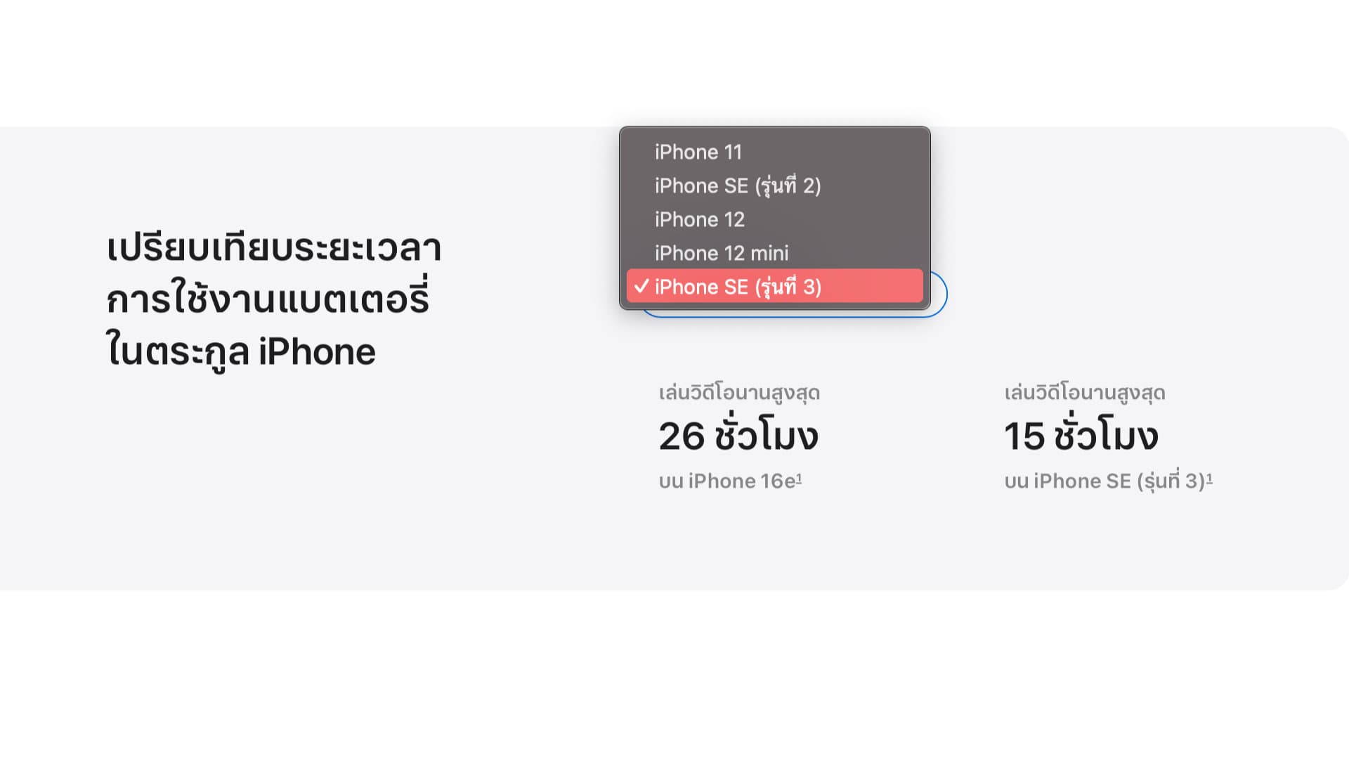 - iPhone 16e เมื่อเทีบกับ iPhone 12 mini, iPhone SE 3 สามารถเล่นวิดีโอได้นานกว่า 9 ชั่วโมง