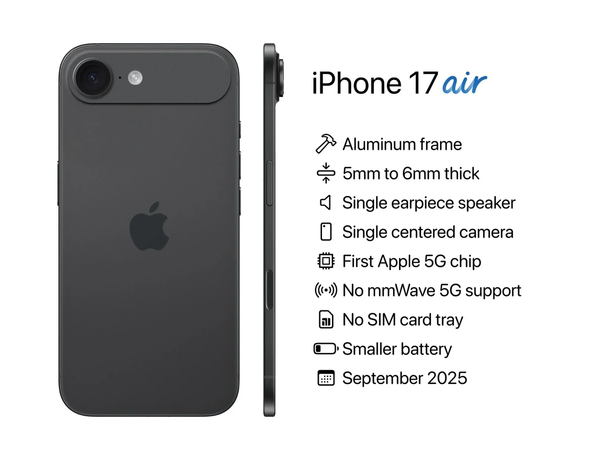iPhone 17 Air ลือว่าจะมาพร้อมชิปโมเด็ม 5G ตัวแรกของ Apple ซึ่งจะมีขนาดเล็กกว่าชิปโมเด็มของ Qualcomm, แต่ชิปของ Apple นั้นจะไม่รองรับ 5G mmWave อาจทำให้ความเร็ว Cellular ช้ากว่าของ Qualcomm