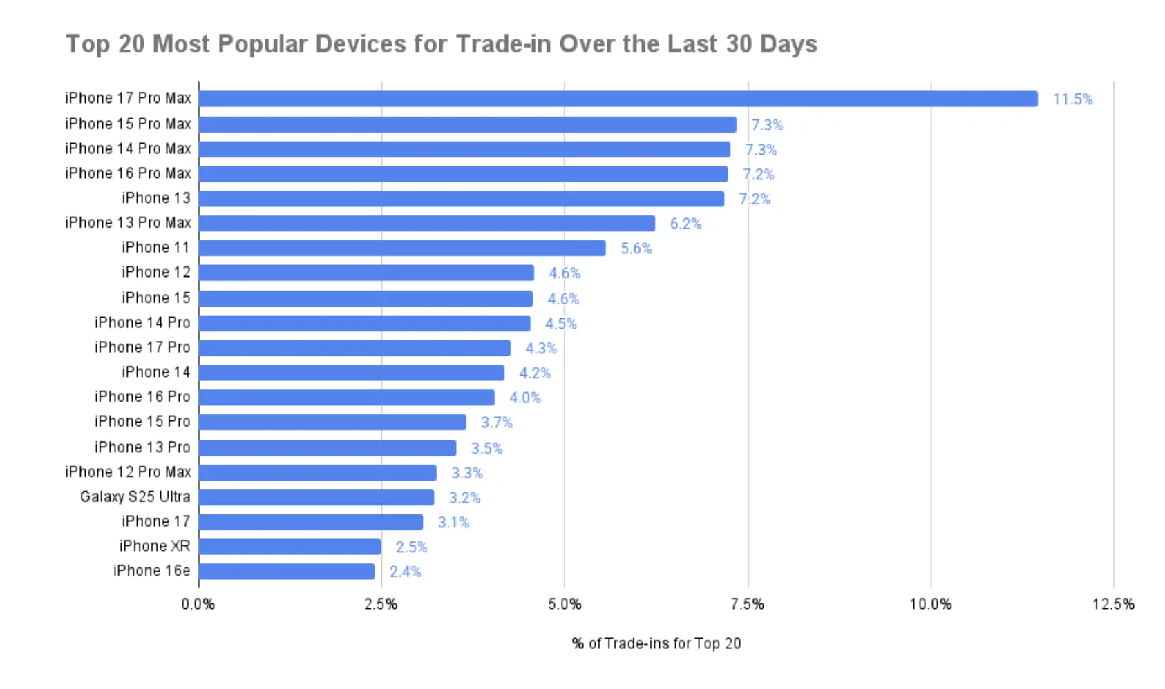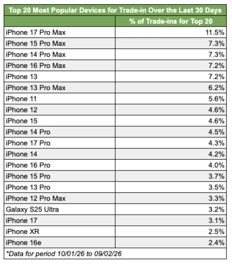 สมาร์ตโฟนรุ่นที่ตามมาในอันดับ ได้แก่ iPhone 15 Pro Max และ iPhone 14 Pro Max มีสัดส่วนที่ 7.3% เท่ากัน รวมถึง iPhone 16 Pro Max และ iPhone 13 มีสัดส่วนที่ 7.2% เท่ากัน, โดยสมาร์ตโฟน 20 อันดับแรก มียอดรวมกันราว 47% สำหรับการนำมา Trade-in