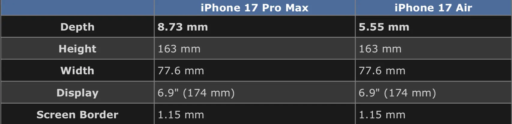 Ice Universe รายงานข้อมูลอีกว่า iPhone 17 Air และ iPhone 17 Pro Max ขนาดตัวเครื่องจะเท่ากันยกเว้นเรื่องความบาง นั่นหมายความว่า iPhone 17 Air มีโอกาสที่จะมีหน้าจอใหญ่ถึง 6.9″