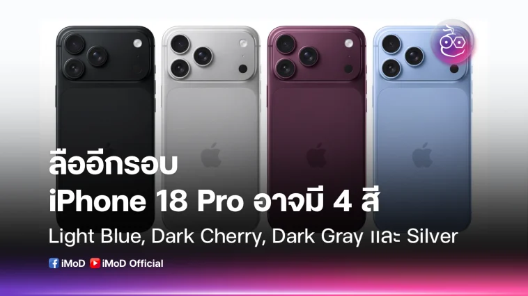 มีรายงานอีกรอบว่า iPhone 18 Pro มี 4 สีใหม่ โดย Dark Cherry เป็นสีไฮไลต์ พร้อมกับ Light Blue, Dark Gray และ Silver