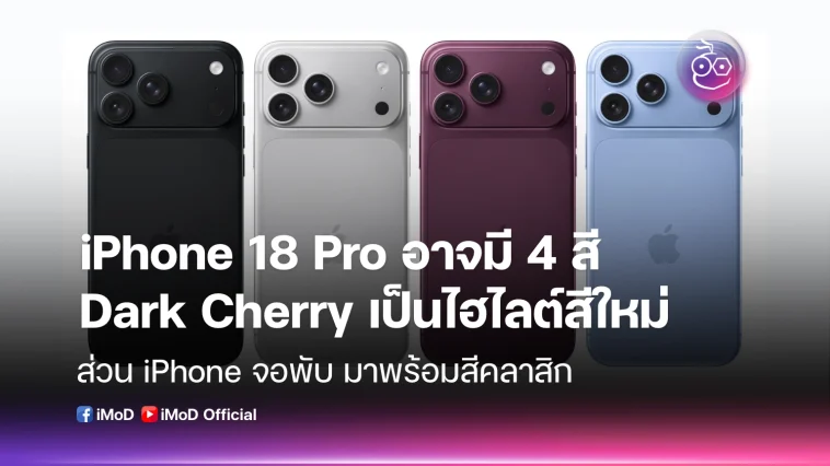 มีรายงานเรื่องสีของ iPhone 18 Pro มาพร้อม 4 สี โดยมี “Dark Cherry” แดงไวน์สุดพรีเมียม พร้อมโทนใหม่ยกชุด