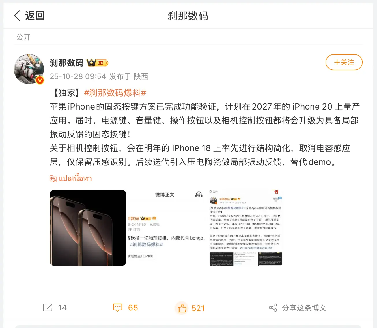 ก่อนหน้านี้บัญชี Instant Digital ได้ออกมาโต้แย้งข่าวลือที่ว่า Apple วางแผนจะตัดปุ่มควบคุมกล้อง (Camera Control) ออกจาก iPhone 18 โดยเวอร์ชันที่เรียบง่ายขึ้นนี้ไม่ได้เกี่ยวกับการลดฟังก์ชันการทำงานของปุ่ม แต่เป็นการประหยัดต้นทุน กล่าวกันว่าโซลูชันที่ใช้อยู่ในปัจจุบันมีราคาสูงมากสำหรับ Apple และก่อให้เกิดค่าใช้จ่ายในการซ่อมหลังการขายที่มีราคาสูง
