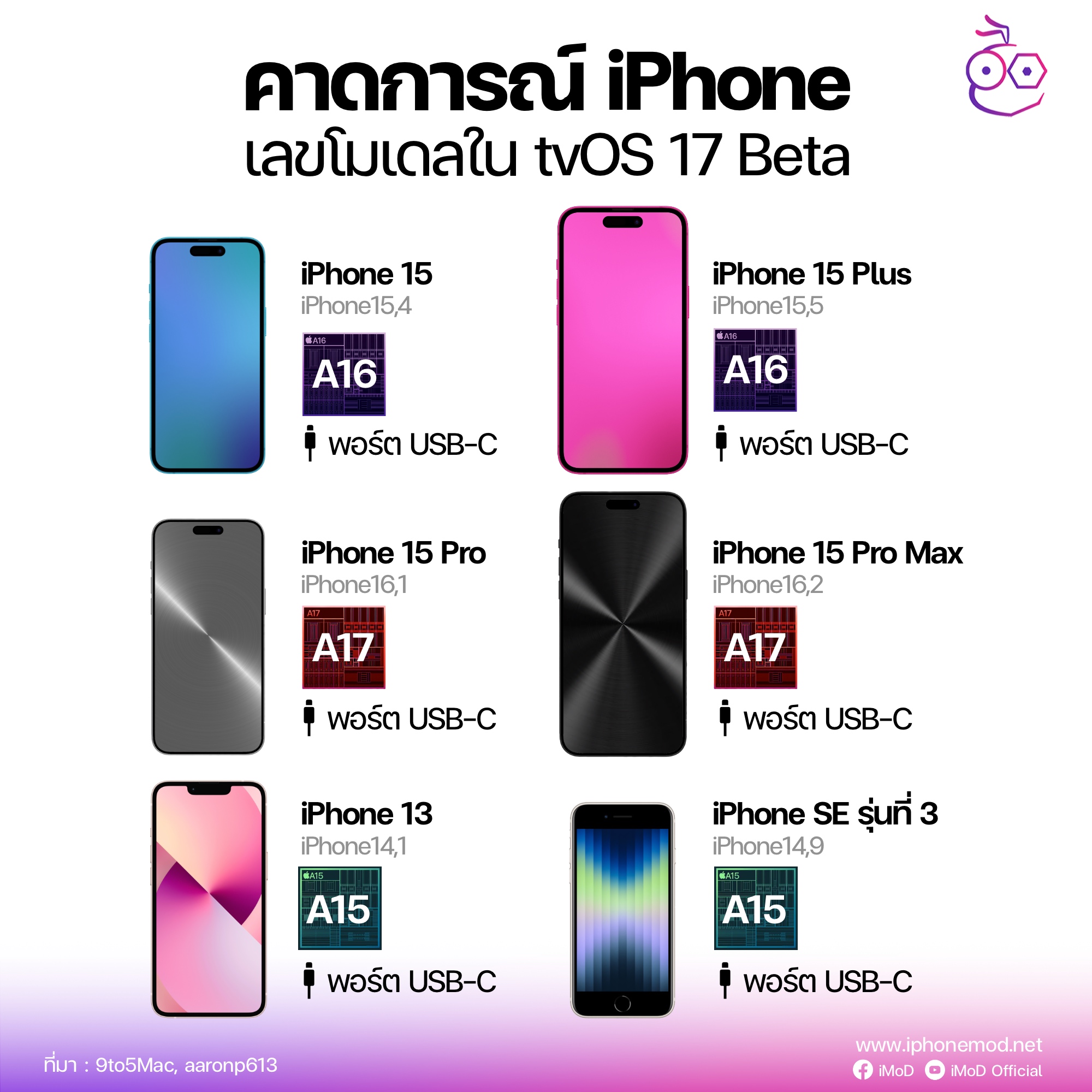 ก่อนหน้านี้มีการพบเลขโมเดลใน tvOS 17 Beta มากถึง 6 เลข โดย 4 เลขคาดว่าเป็นของ iPhone 15 ซีรีส์ ส่วนอีก 2 เลขอาจเป็นการนำ iPhone รุ่นเก่ามาเปลี่ยนพอร์ตเป็น USB-C