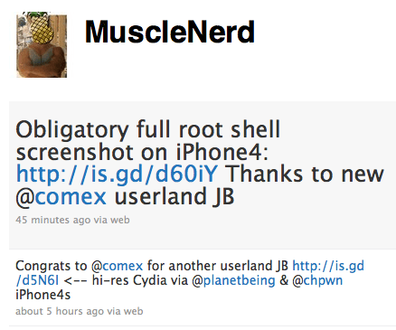 ถึงมือผู้ใช้เมื่อวันที่ 24 มิย. 53 ที่ผ่านมา วันนี้ก็ล่วงเลยเข้าสู่วันที่ 3 ของการได้รับ iPhone 4 มาครอบครองของหลายๆคน(คนไทยส่วนน้อยแต่ที่เมืองนอกจะเยอะ) แต่หลายๆคนก็ยังอยากที่จะรู้ว่าเมื่อไหร่ iPhone 4 นั้นจะสามารถเจลเบรคได้ ตอนนี้ได้รับการยืนยันจากพี่ๆ Dev team แล้วนะครับว่า “iPhone 4 Jailbroken”