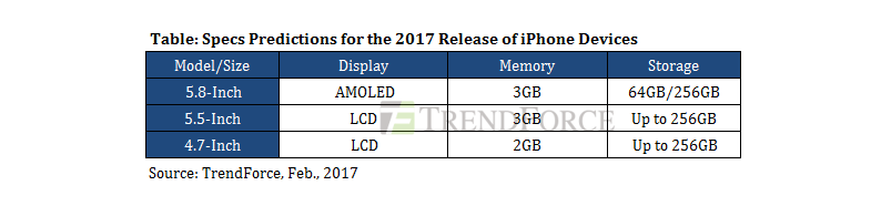 TrendForce ได้รายงานผลวิจัยว่า ในปี 2017 นี้ Apple วางแผนที่จะผลิต iPhone รุ่นใหม่จำนวน 100 ล้านเครื่อง และปริมาณการผลิตในอัตรานี้ ทำให้ Apple มีโอกาสที่จะจำหน่าย iPhone รุ่นใหม่ได้มากถึง 230 ล้านเครื่องไปจนถึงปีหน้า