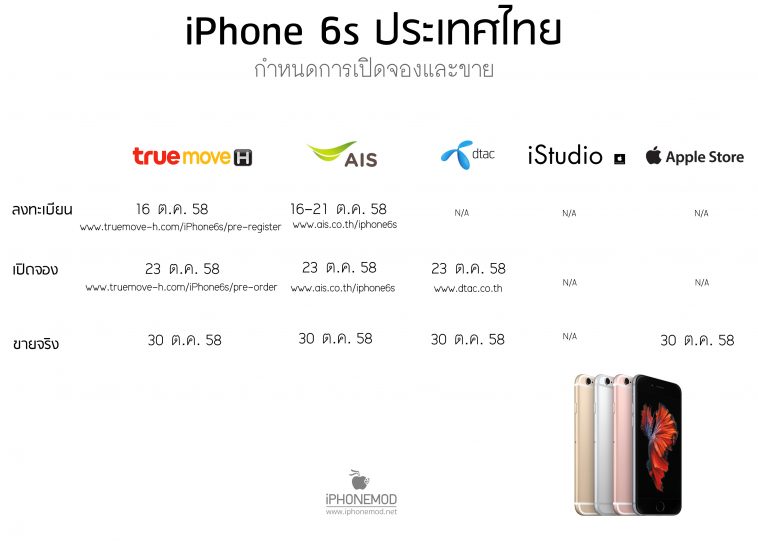 ประกาศที่หน้าเว็บของ Apple.com/th/ แจ้งมาแล้วว่าจะเร่ิมจำหน่าย iPhone 6s, 6s Plus ในวันที่ 30 ตุลาคม 2558 นี้เช่นกัน เรียกกว่างานนี้ในไทยทุกเจ้าจะขายพร้อมๆ กัน