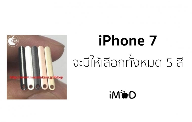 วันพุธหน้า ที่ 7 กันยายน 2559 เวลาประมาณเที่ยงคืนที่ย่างเข้าสู่วันที่ 8 ทาง Apple ยืนยันแล้วว่าจะจัดงานเปิดตัว iPhone 7 ในวันนั้น รายละเอียดและข่าวต่างๆ ยังคงมีให้เห็นกันเรื่อยๆ แม้จะใกล้วันจัดงานแล้วก็ตาม ล่าสุดมีรายงานจาก Appleinsider อ้างอิงจาก Macotakara แจ้งว่า iPhone 7 จะมีให้เลือกทั้งหมด 5 สี