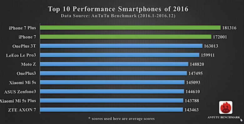 AnTuTu ได้รายงานผลการจัดอันดับ Smartphone ที่มีประสิทธิภาพสูงสุดในปี 2016 โดยอันดับหนึ่งคือ iPhone 7 Plus ที่มีคะแนนปรียบเทียบประสิทธิภาพสูงถึง 181,316 รองลงมาคือ iPhone 7 มีคะแนน 172,001 โดย OnePlus 3T ได้คะแนนสูงสุดในกลุ่ม Andriod