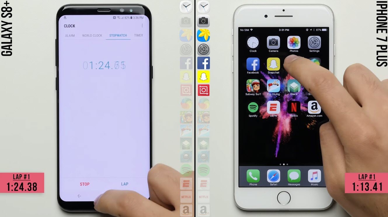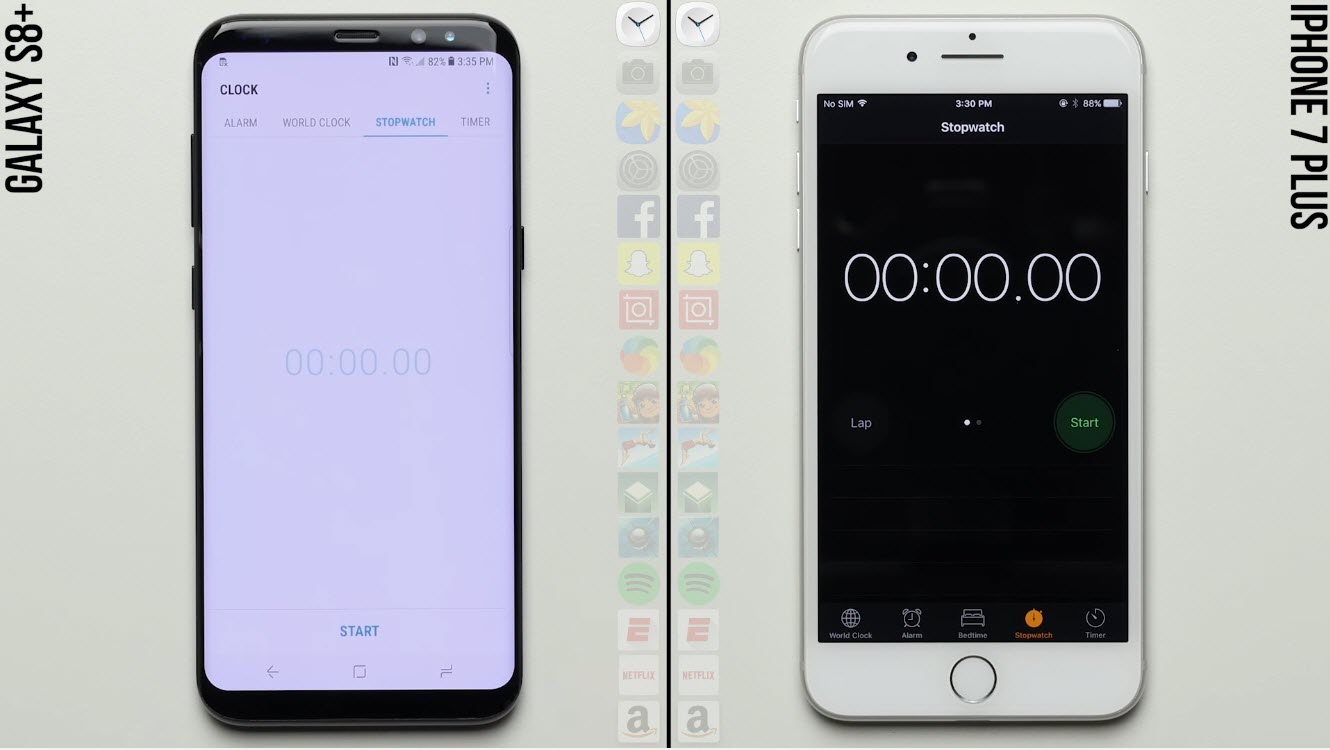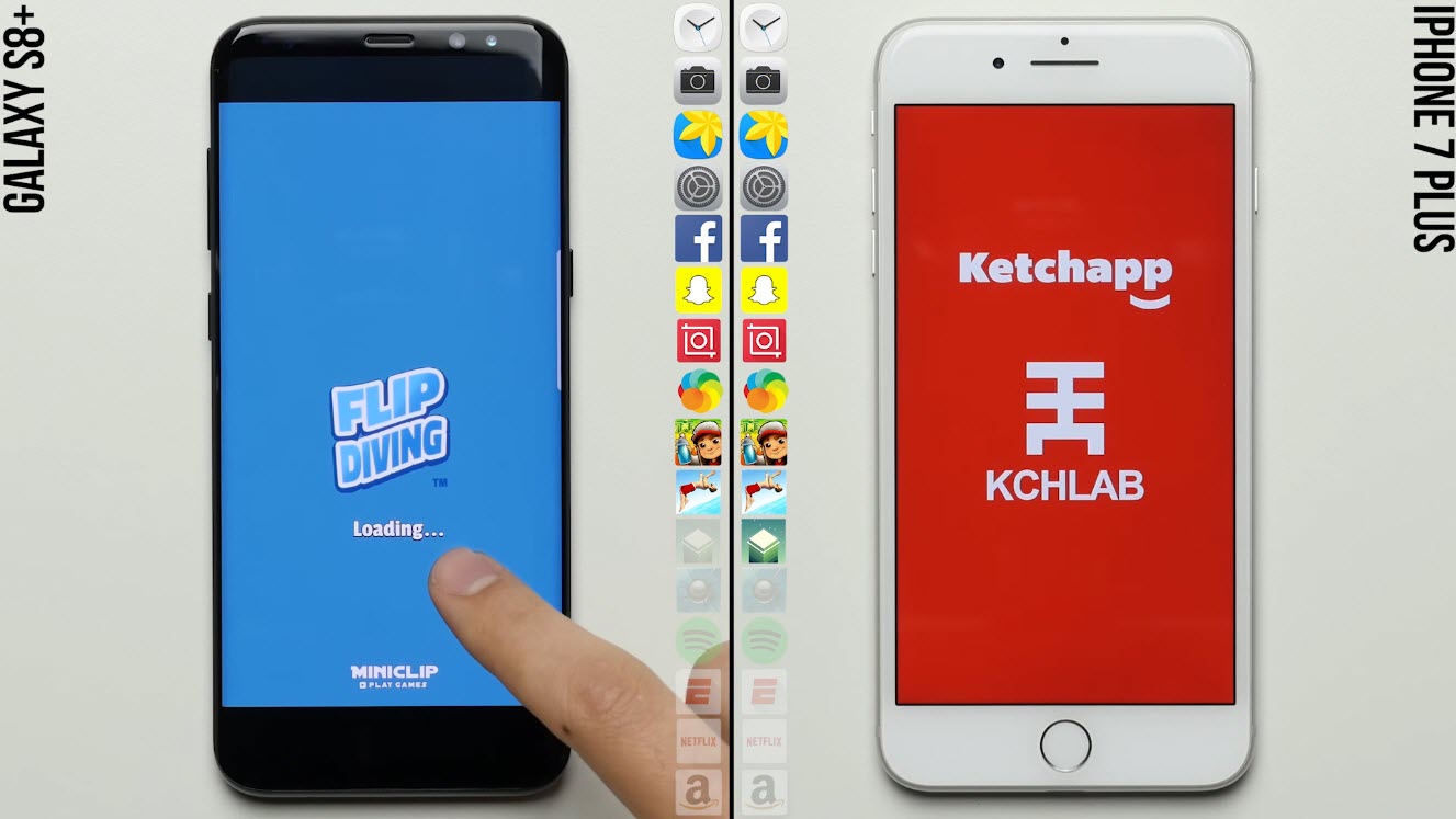 เริ่มต้นผู้ทดสอบได้เปิดแอปนาฬิกาจับเวลา เปิดแอปกล้องและแอปอื่นๆตามมา โดย iPhone 7 Plus จะใช้เวลาในการโหลดข้อมูลในแอป Facebook นานกว่า Galaxy S8+