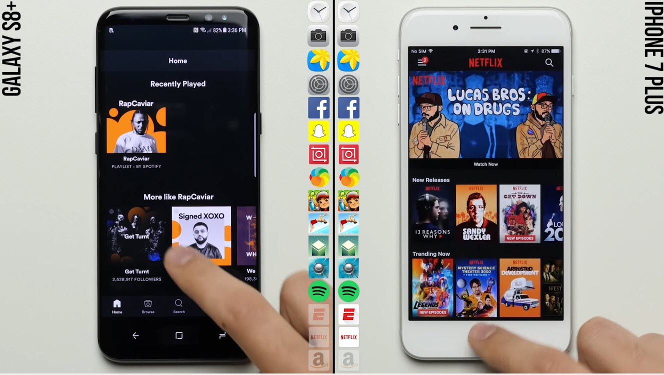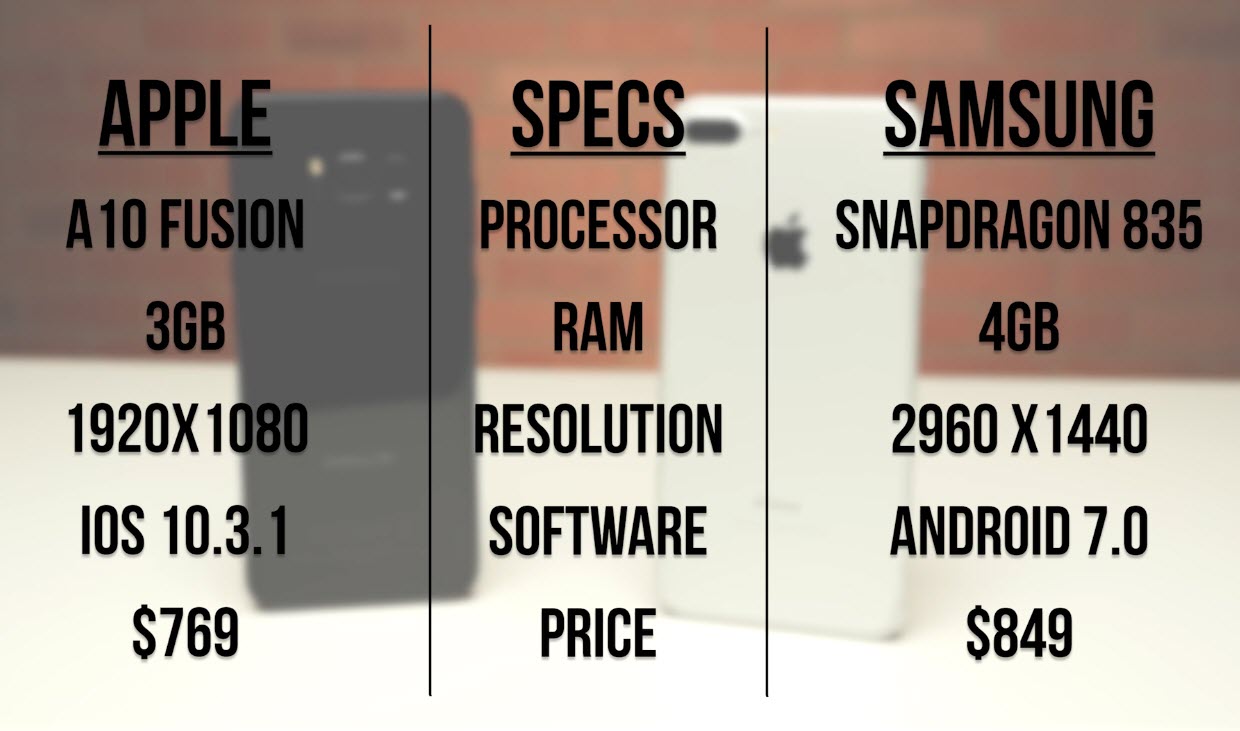 ก่อนอื่นเรามาทราบสเปคของแต่ละรุ่นกันก่อน โดย Galaxy S8+ เป็น Smartphone รุ่นใหม่ของ Samsung เปิดตัวเมื่อช่วงต้นปีที่ผ่านมา ใช้ชิป Qualcomm Snapdragon 835 และ RAM 4GB ส่วน iPhone 7 Plus เป็น iPhone เรือธงของ Apple เปิดตัวเมื่อปีปลายที่แล้วใช้ชิป A10 และ RAM 3GB