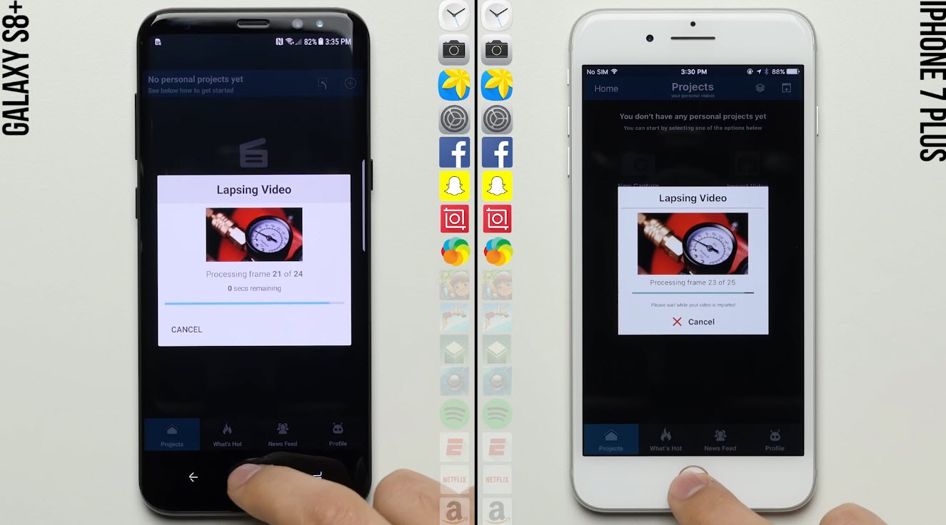 ถัดมาผู้ทดสอบได้เปิดแอปเพื่อ Lapsing Video โดย iPhone 7 Plus และ Galaxy S8+ ใช้เวลาประมวลผลใกล้เคียงกัน