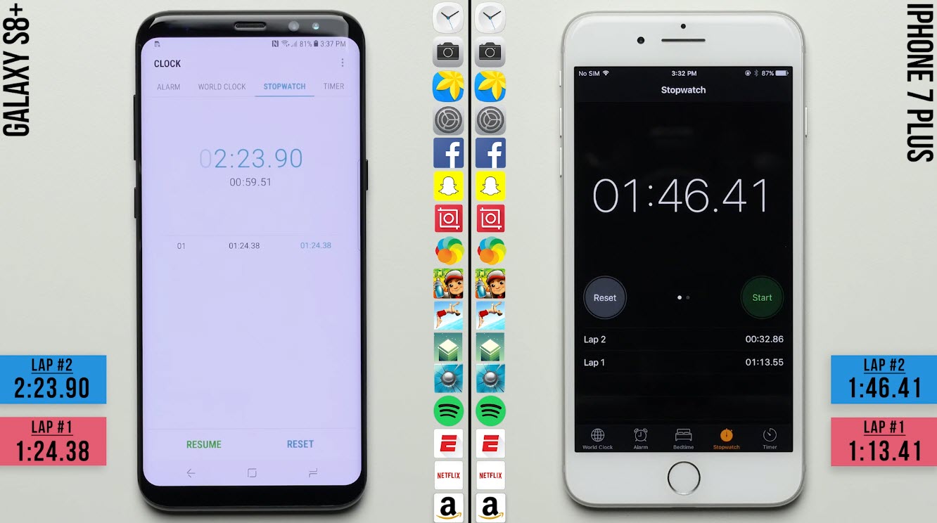 PhoneBuff สื่อต่างประเทศที่ทำรีวิวทดสอบเปรียบเทียบความเร็ว Smartphone รุ่นต่างๆ มาหลายรุ่นแล้ว ล่าสุดก็ได้ทำรีวิวทดสอบเปรียบเทียบความเร็วในการเปิด-ปิดแอป ระหว่าง Galaxy S8+ และ iPhone 7 Plus ให้ชมกันว่ารุ่นไหนทำได้เร็วกว่ากัน