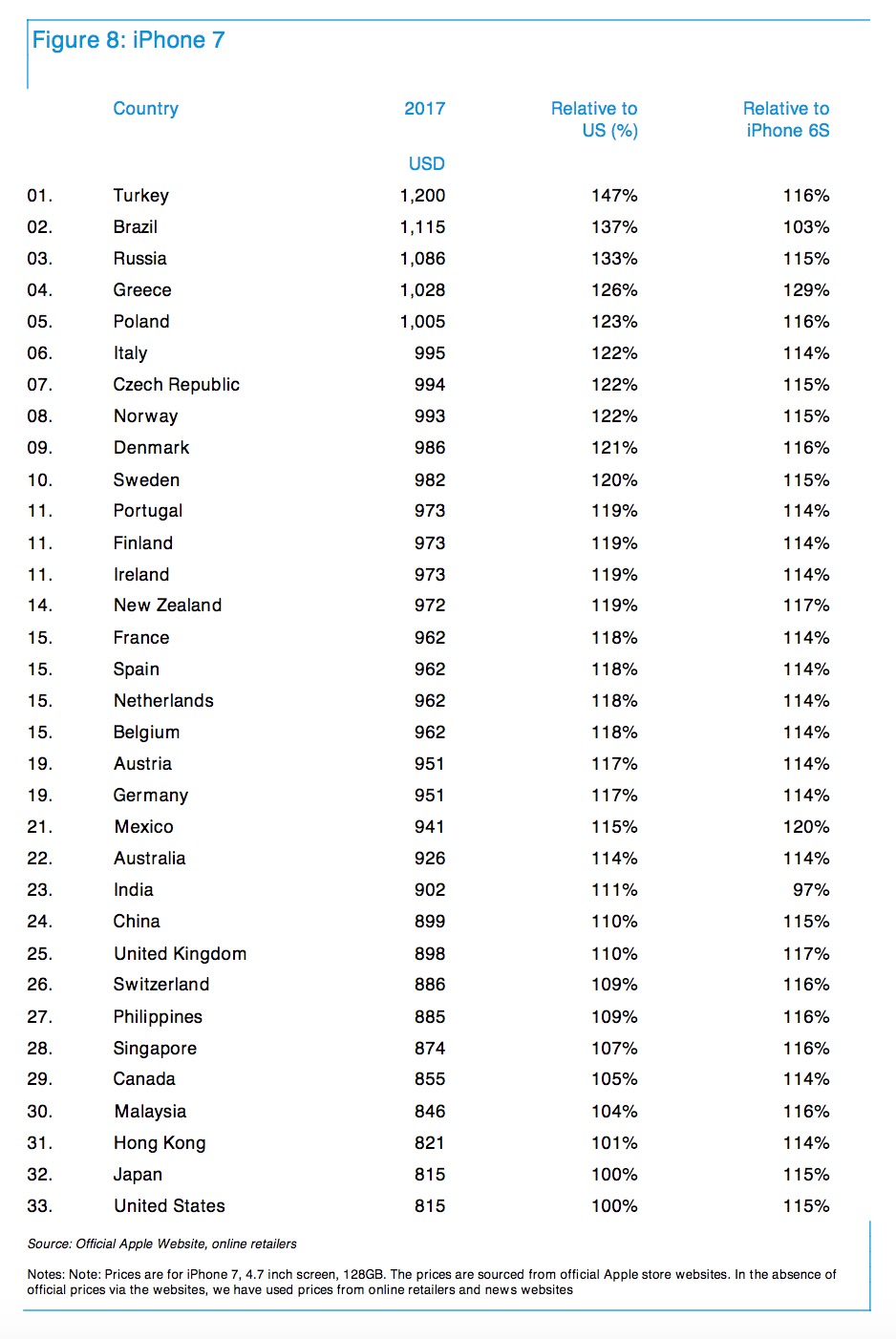 โดยประเทศ 5 อันดับแรกนั้นได้แก่ ตุรกี, บราซิล, รัสเซีย, กรีซ และโปแลนด์ ตั้งราคาจำหน่าย iPhone 7 มากกว่า 1,000 ดอลล่าร์ ซึ่งเป็นราคาที่สูงกว่าสหรัฐอเมริกาถึง 25% – 50% เลยทีเดียว