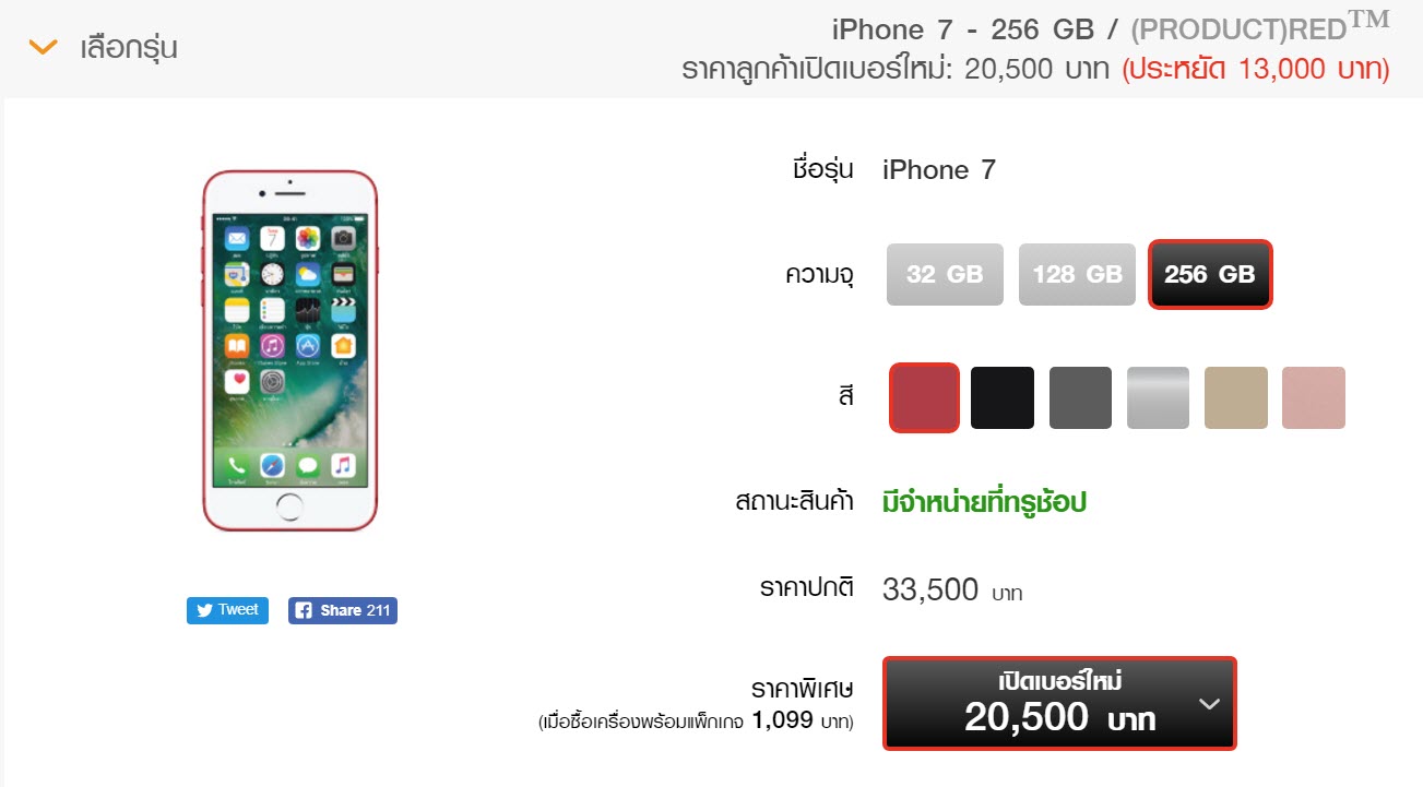 เพียงเปิดเบอร์ใหม่กับทรูมูฟ เอช รับสิทธิ์ซื้อ iPhone 7 RED 256GB พร้อมแพ็กเกจ 1,099 เริ่มต้นที่ 20,500 บาท + จ่ายล่วงหน้า 4,000 = 24,500 บาท