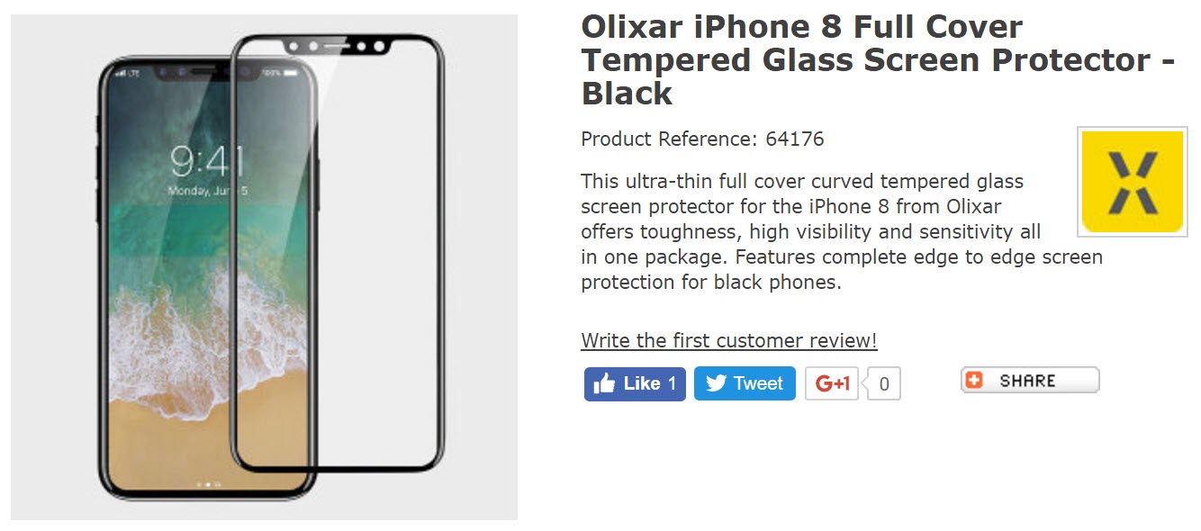 ล่าสุดเว็บไซต์ MobileFun ได้เปิดให้สั่งจองล่วงหน้า (Pre-Order) ฟิล์มกระจกสำหรับ iPhone 8 ในราคา 31.99 ดอลลาร์ (ประมาณ 1,082 บาท) ที่มีลักษณะเหมือนกับภาพแนวคิด iPhone 8 ของ iDropNews และ ภาพหลุดกระจกหน้า ก่อนหน้านี้