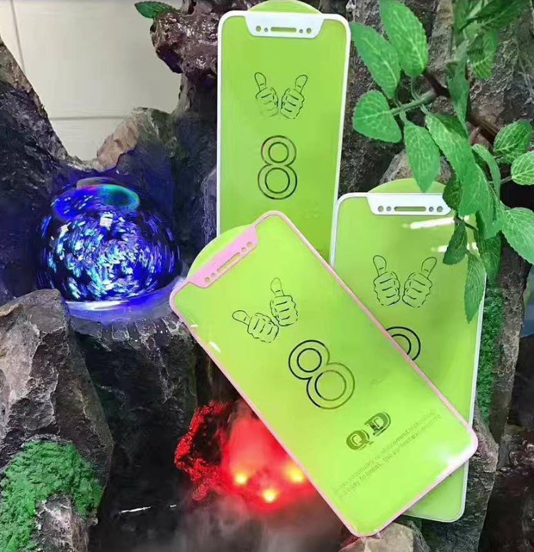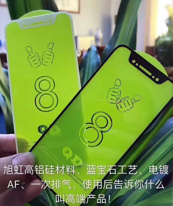 ฟิล์มกระจก iPhone 8 ที่เห็นในเว็บไซต์นั้น เป็นกระจกเต็มขอบที่มีขอบเล็กน้อย, ไม่มีการเว้นช่องสำหรับปุ่ม Home, มีการเว้นพื้นที่ด้านบนเล็กน้อย สำหรับกล้องหน้า 2 ตัว, ลำโพงสนทนา และเซนเซอร์วัดระยะ 3 มิติ