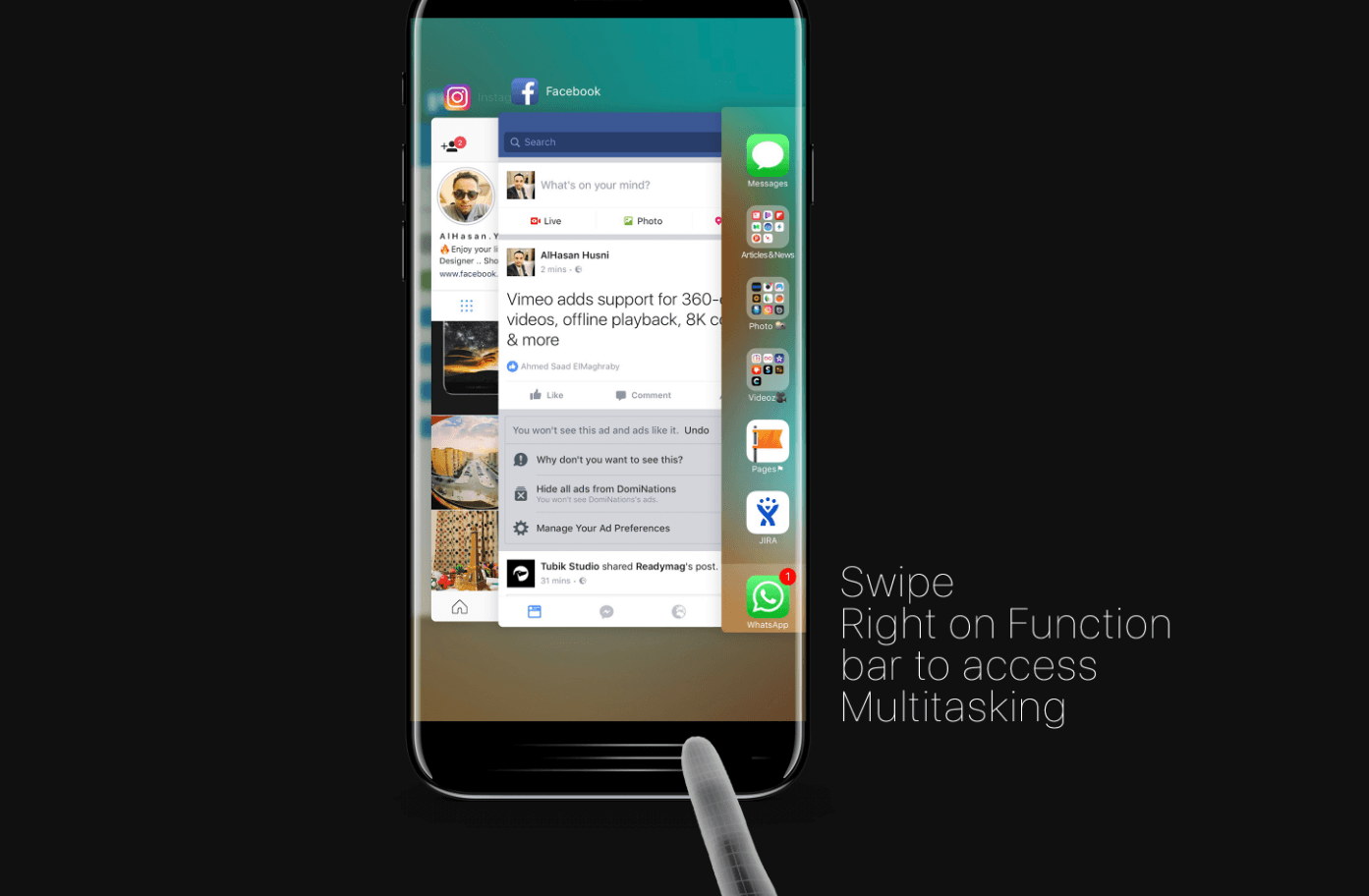 iPhone 8 หรือ iPhone Edition ที่มีการพูดถึงเกี่ยวกับคุณสมบัติเด่นอย่างจอ OLED เต็มขอบขนาด 5.8 นิ้ว ที่มีการตัดปุ่ม Home ออกไป แล้วใช้ปุ่ม Home เสมือนผ่าน แผงฟังก์ชั่นเสมือน (Function Bar) แทน