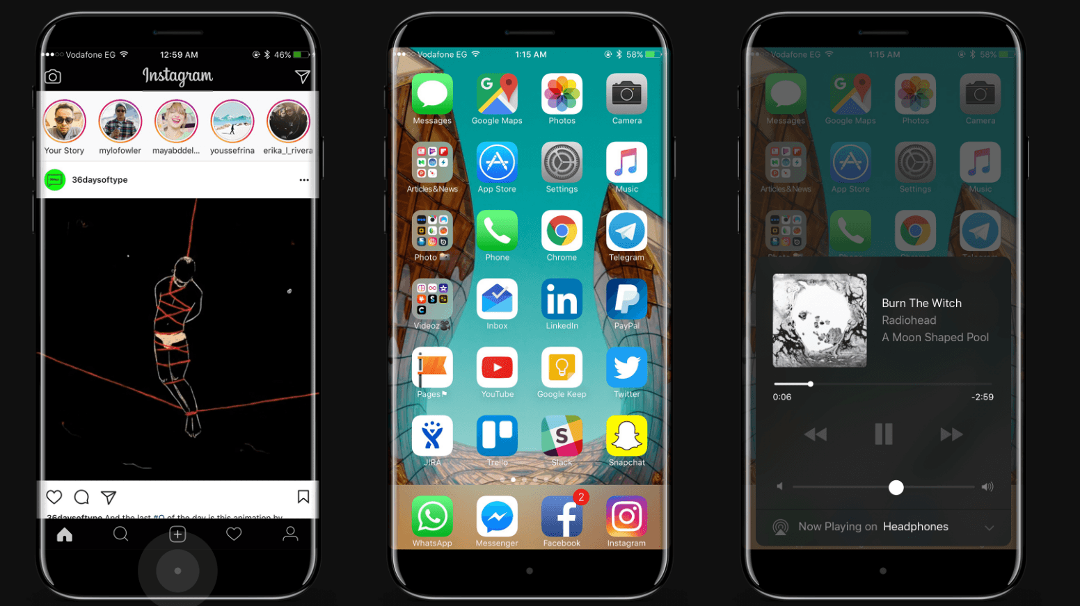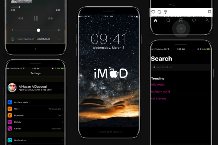 ในภาพแนวคิดมีการแสดง iOS ในรูปแบบโทนสีดำ หรือว่า Dark Mode ของแอป Apple Music, Control Center, Instagram และหน้าจอการตั้งค่า