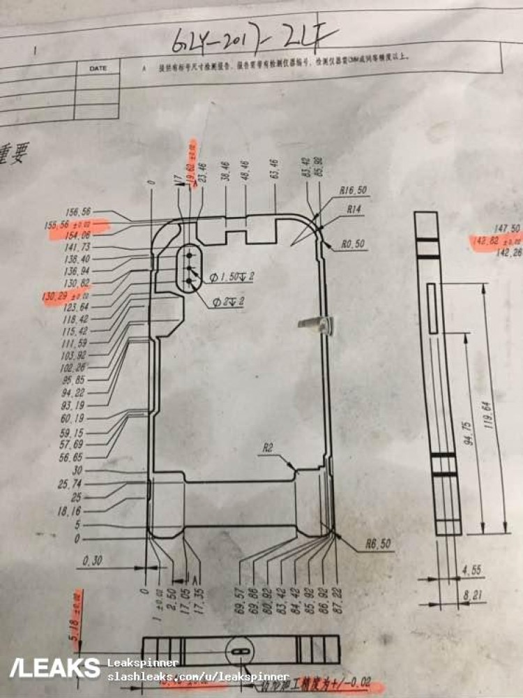 นอกจากมีภาพถ่ายชิ้นส่วนแม่พิมพ์ iPhone 8 แล้ว ก็ยังมีภาพร่างแม่พิมพ์ iPhone 8 อีกหนึ่งชุด โดยมีการใส่รายละเอียดตัวเลขในแต่ละจุดของภาพร่างไว้ โดยภาพร่างนั้นก็มีกล้องหลัง 2 ตัวแนวตั้งเช่นเดียวกัน