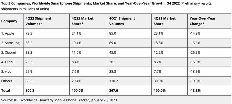 สำหรับยอดส่งมอบสมาร์ตโฟนโดยรวมของทุกแบรนด์ในไตรมาสปลายปี 2022 นั้น มียอดตกลงไป 18.3% มียอดส่งมอบทั้งสิ้น 300 ล้านเครื่อง น้อยกว่าปีก่อนหน้าที่ทำได้ 367 ล้านเครื่อง