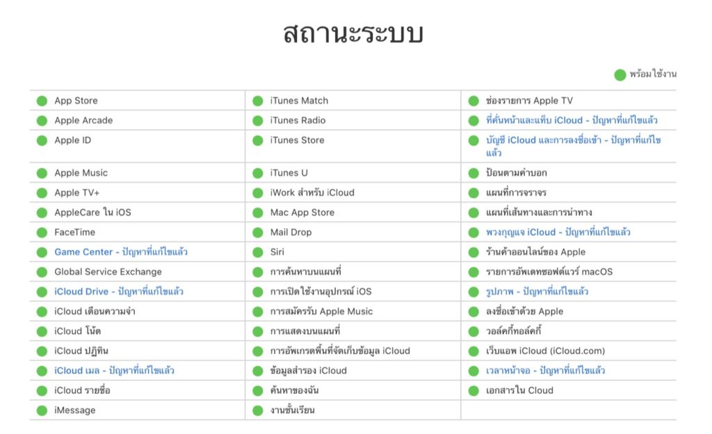 เมื่อเข้าไปตรวจสอบ System Status ของ Apple ก็พบว่าขึ้นสีเขียวปกติ แต่การที่ผู้ใช้หลายรายพบปัญหานี้ในเวลาไล่เลี่ยกัน คาดว่าเป็นปัญหาจากฝั่ง Apple เอง