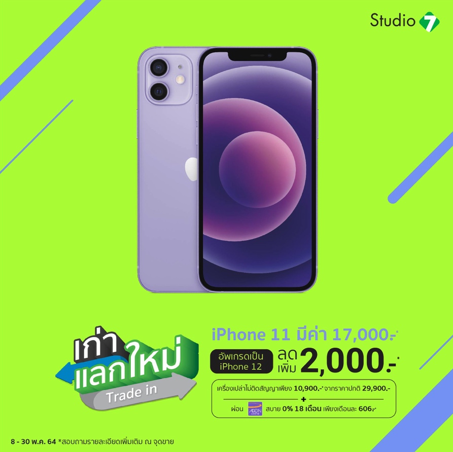 iPhone 11 มีค่า 17,000.- อัพเกรดเป็น iPhone 12 ลดเพิ่ม 2,000.- เครื่องเปล่าไม่ติดสัญญาเพียง 10,900.-* ที่ร้าน Studio 7 ทุกสาขา วันที่ 8 พ.ค. 64 – 30 พ.ค. 64