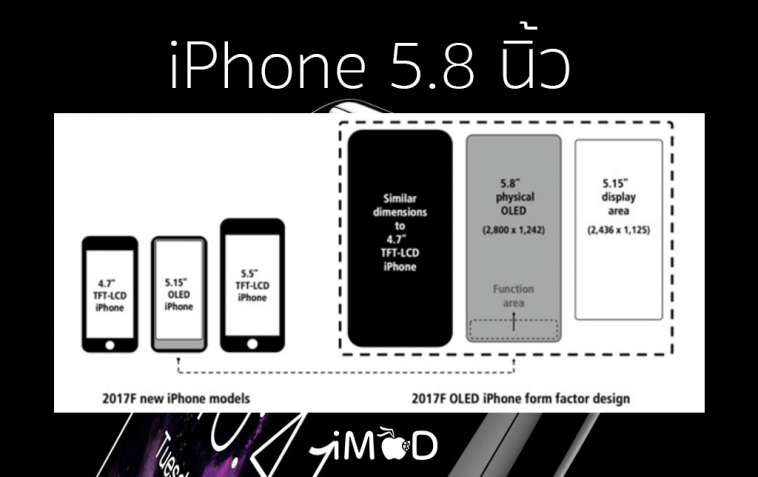 Ming-Chi Kuo เจ้าเดิมเผยรายงานการวิเคราะห์ iPhone รุ่นใหม่ปี 2017 ที่คาดว่าจะมีหน้าจอ OLED 5.8″ ว่าตัวจอ OLED จะเป็นจอแบบเต็มขอบข้าง (ไร้ขอบ) แต่จะมีพื้นที่ สำหรับใช้งานแสดงผลจริงในส่วนตรงกลาง 5.15″ โดยพื้นที่ด้านล่างจะเหลือไว้สำหรับแผงฟังก์ชั่นเสมือน