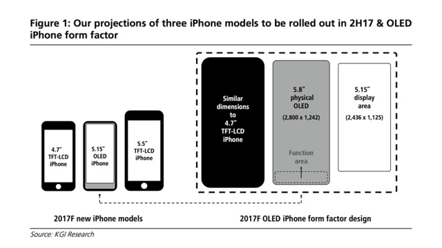 Ming-Chi Kuo เจ้าเดิมเผยรายงานการวิเคราะห์ iPhone รุ่นใหม่ปี 2017 ที่คาดว่าจะมีหน้าจอ OLED 5.8″ ว่าตัวจอ OLED จะเป็นจอแบบเต็มขอบข้าง (ไร้ขอบ) แต่จะมีพื้นที่ สำหรับใช้งานแสดงผลจริงในส่วนตรงกลาง 5.15″ โดยพื้นที่ด้านล่างจะเหลือไว้สำหรับแผงฟังก์ชั่นเสมือน