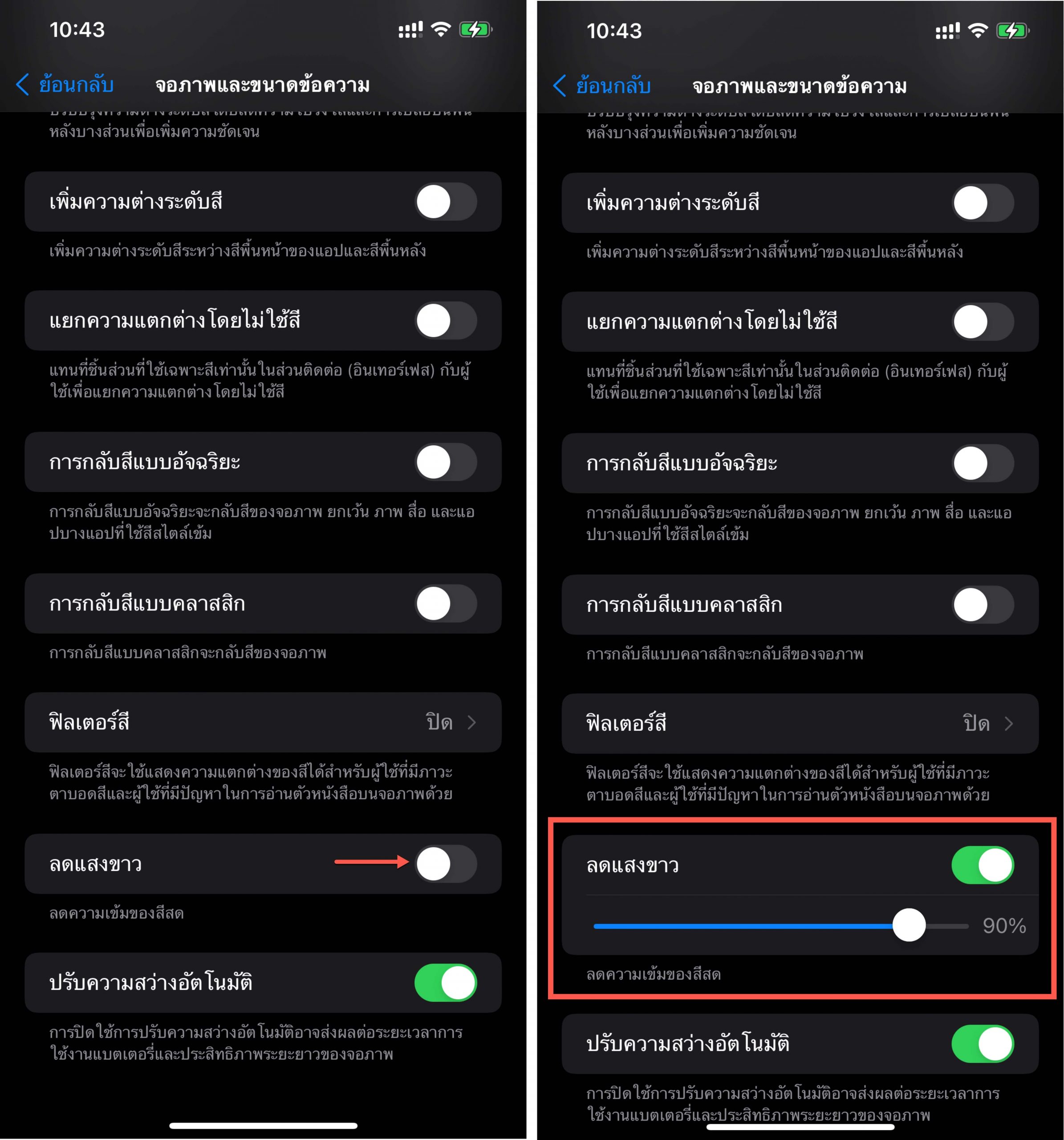 เลื่อนเปิด ลดแสงขาว > ปรับเลื่อนความเข้มของสีสดเป็น 90%