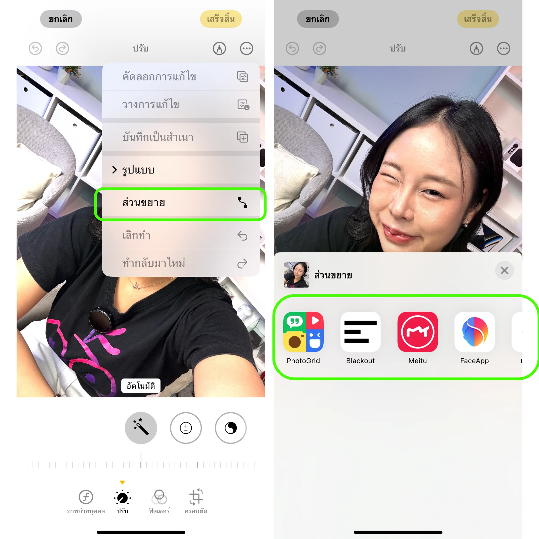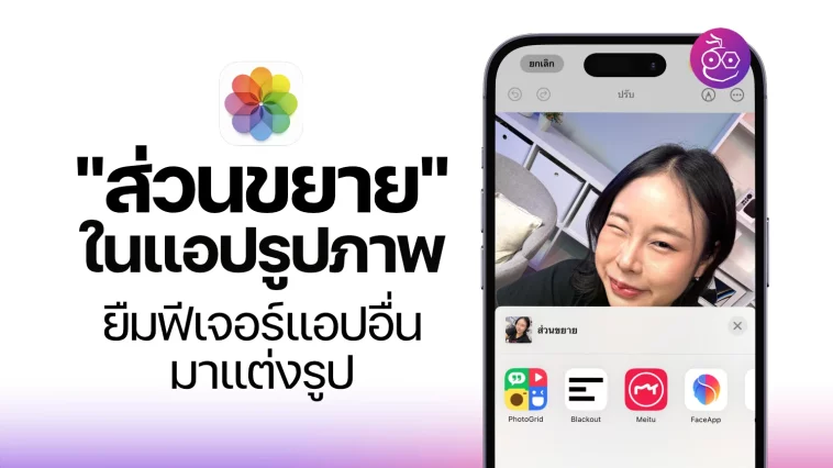 แอปรูปภาพ (Photos) บน iPhone ได้พัฒนาให้รองรับการใช้งาน “ส่วนขยาย” (Extensions) ที่ช่วยให้ผู้ใช้สามารถดึงความสามารถจากแอปพลิเคชันอื่น ๆ มาปรับแต่งรูปภาพได้ทันทีโดยไม่ต้องออกจากแอปรูปภาพ