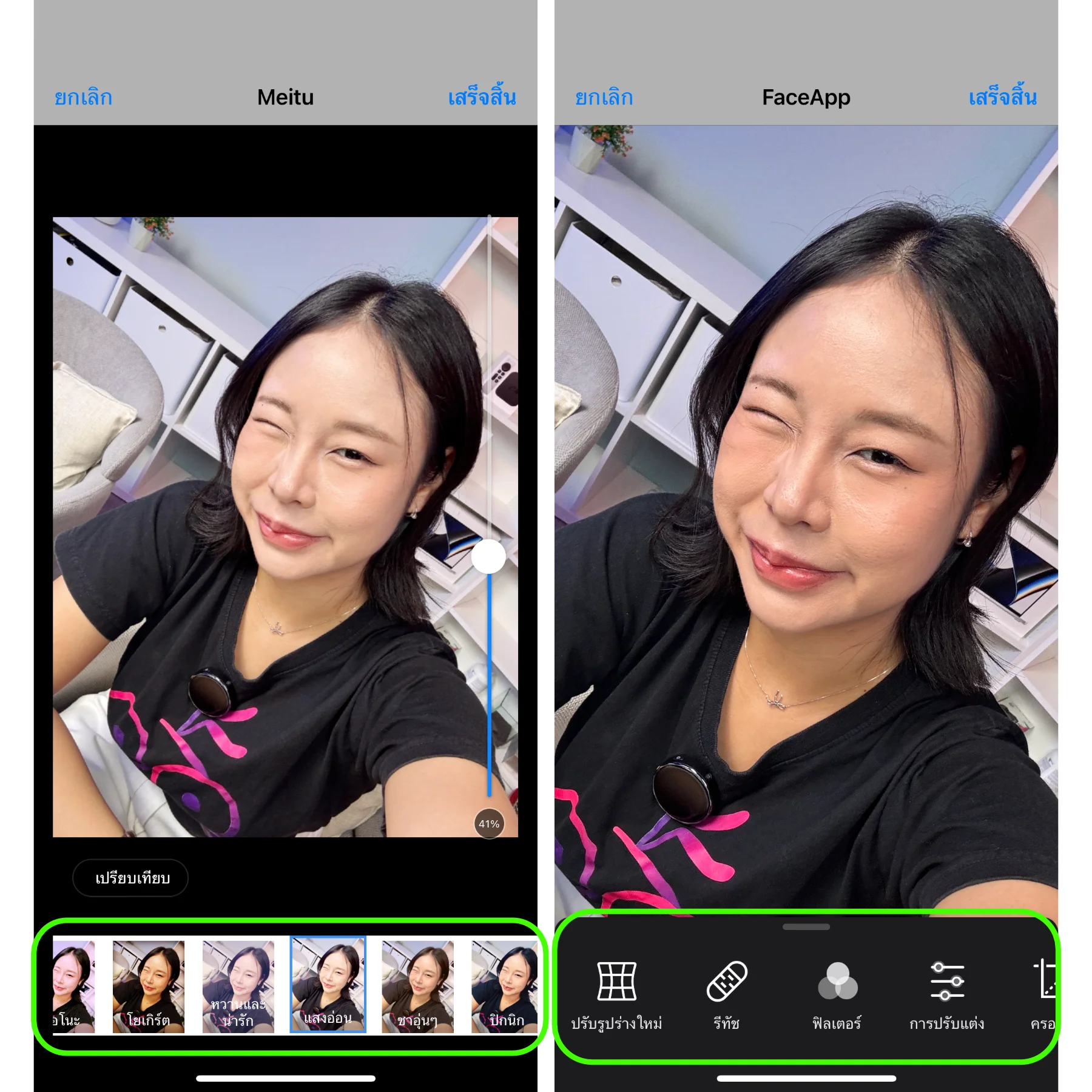 ตัวอย่างเครื่องมือจากแอปแต่งรูปภายนอก หากใช้ Meitu จะมีฟิลเตอร์สีให้ใช้ สามารถใช้เปลี่ยนโทนภาพและโทนผิวได้ สำหรับ Face App จะมีเครื่องมือมากมาย ตั้งแต่เครื่องมือบีบหน้า ไปจนถึงการลบสิว