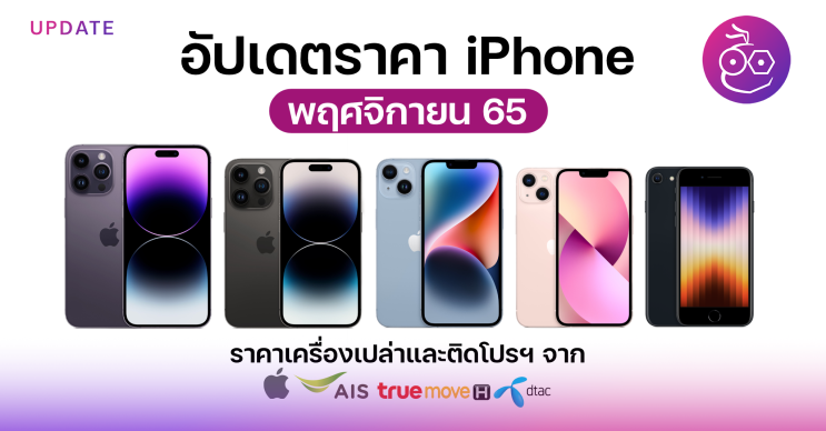 ข้อมูลนี้แสดงราคา iPhone เครื่องเปล่ารุ่นที่ Apple วางขายออนไลน์และ iPhone ราคาพร้อมแพ็กเกจที่ถูกสุดของแต่ละเครือข่าย คือ AIS, TrueMove H, DTAC (ไม่รวมร้านค้าอื่นๆ นอกจากนี้) ประจำเดือน พ.ย. 65