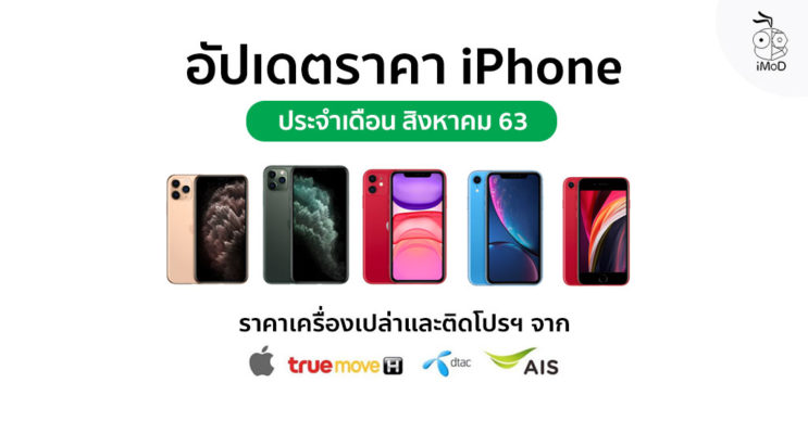 ข้อมูลนี้แสดงราคา iPhone เครื่องเปล่ารุ่นที่ Apple วางขายออนไลน์และ iPhone ราคาพร้อมแพ็กเกจที่ถูกสุดของแต่ละเครือข่าย คือ TrueMove H, AIS, DTAC (ไม่รวมร้านค้าอื่นๆ นอกจากนี้) ประจำเดือน ส.ค. 63