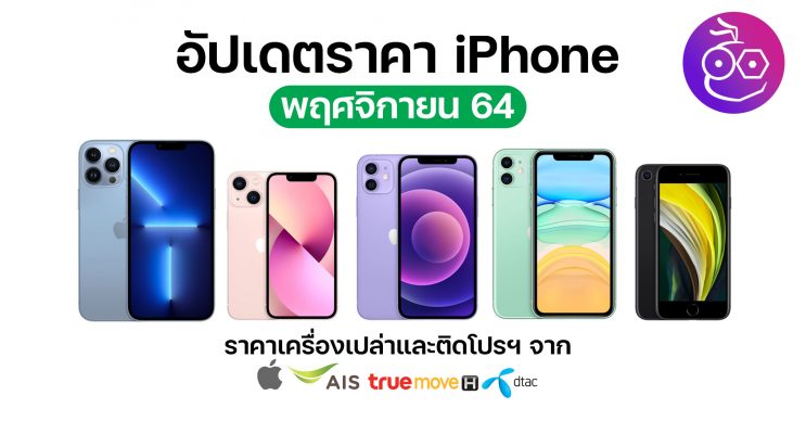 ข้อมูลนี้แสดงราคา iPhone เครื่องเปล่ารุ่นที่ Apple วางขายออนไลน์และ iPhone ราคาพร้อมแพ็กเกจที่ถูกสุดของแต่ละเครือข่าย คือ AIS, TrueMove H, DTAC (ไม่รวมร้านค้าอื่นๆ นอกจากนี้) ประจำเดือน พ.ย. 64